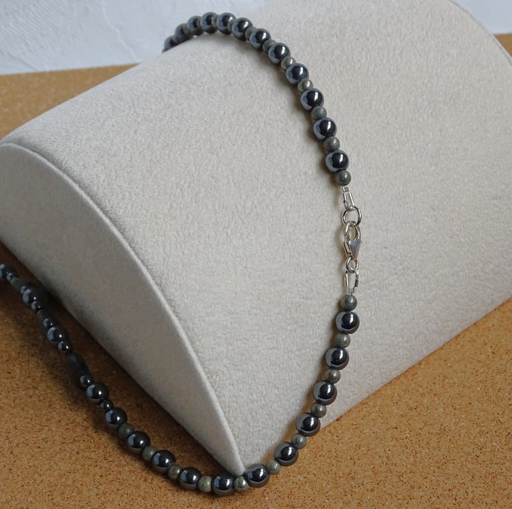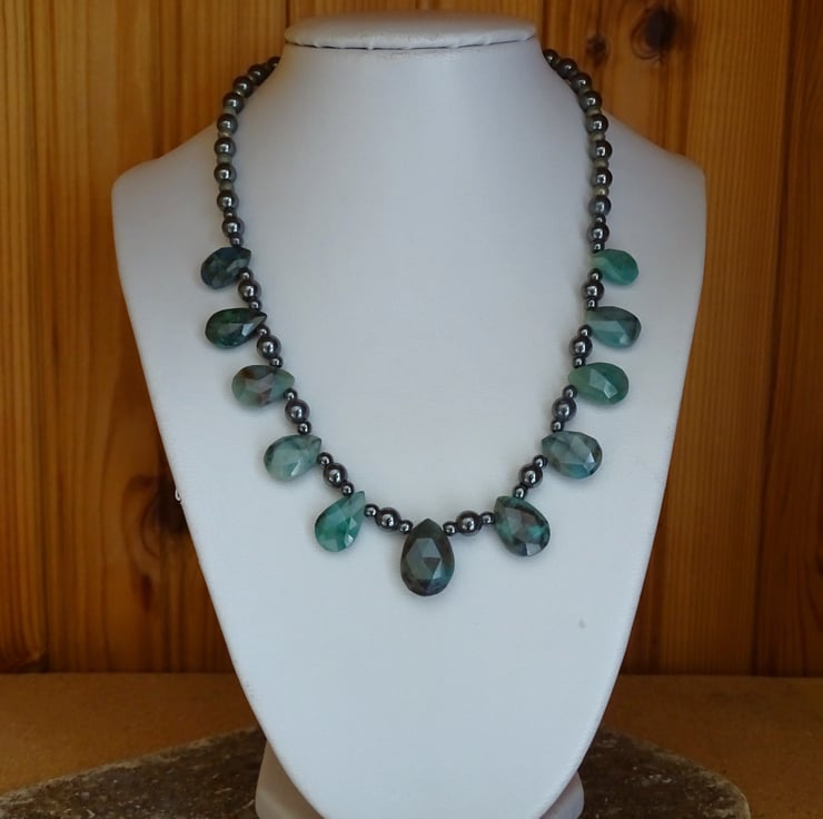 This necklace is made with faceted Chrysocolla teardrops, interspersed with Haematite and Pyrite rounds. Secured with a sterling silver lobster clasp fastening.