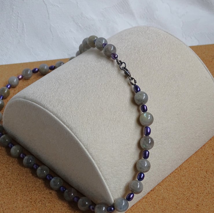 This necklace is made with round Labradorite beads interspersed with small electric blue pearls. Secured with a sterling silver lobster clasp fastening.