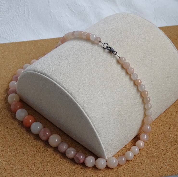 This necklace is made with Peach Aventurine beads secured with a sterling silver lobster clasp fastening.