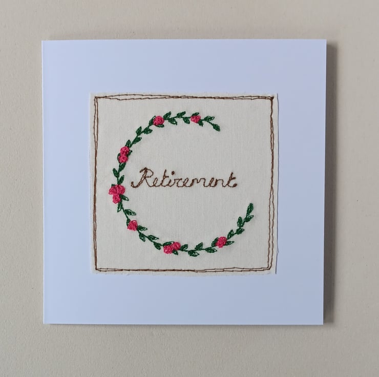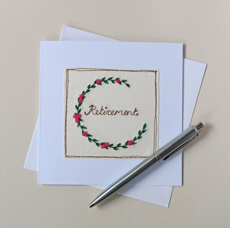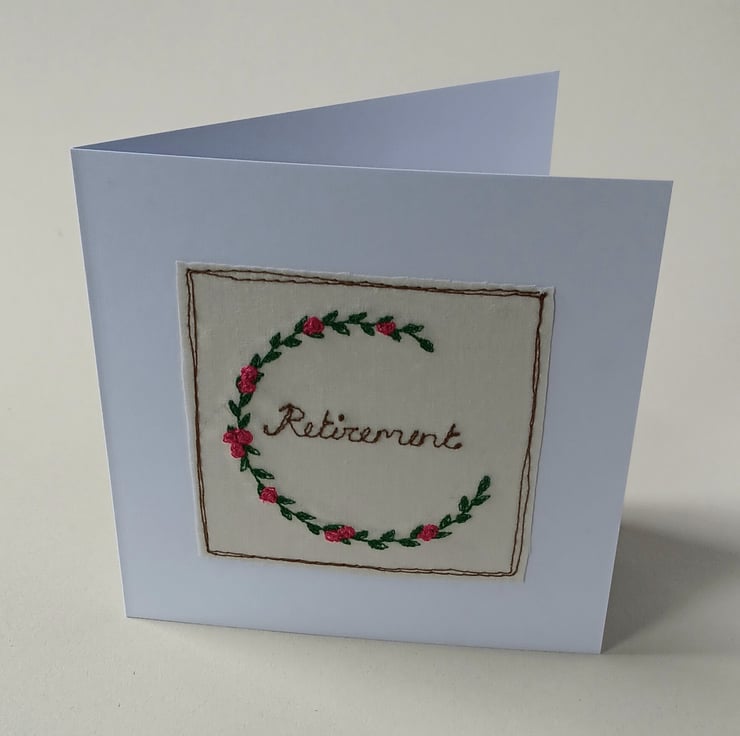 A beautiful flower card for sending best wishes for a retirement. The design is made by sewing a wreath of leaves and pink flowers using free motion embroidery, and the word Retirement also sewn free hand on the machine. The design is then sewn straight onto white card.