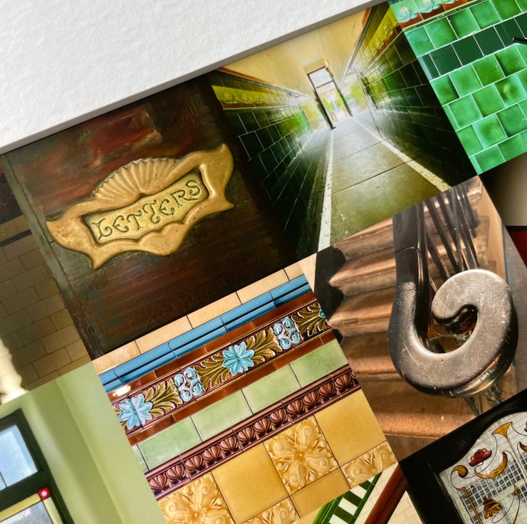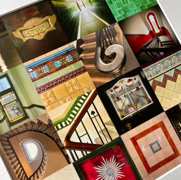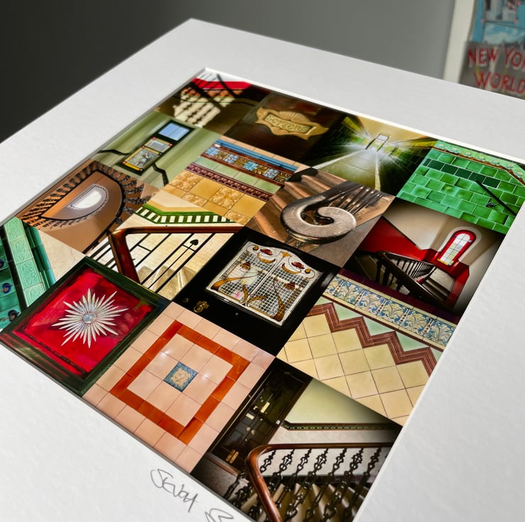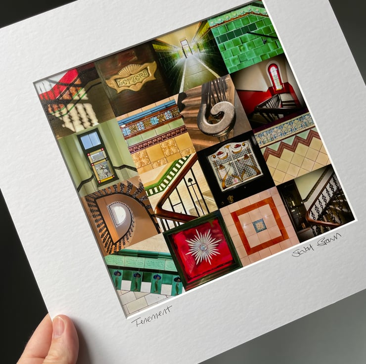 There’s something special about the atmosphere of Glasgow tenement closes and I have tried to capture some of the magic in this new print. It’s been a long time in the making with many trips up and down stairwells! I have selected my favourite shots of tiles, bannisters, stained glass and one lovely letterbox. Made in Dennistoun with love.