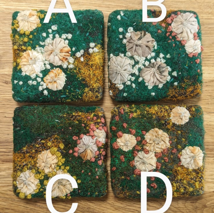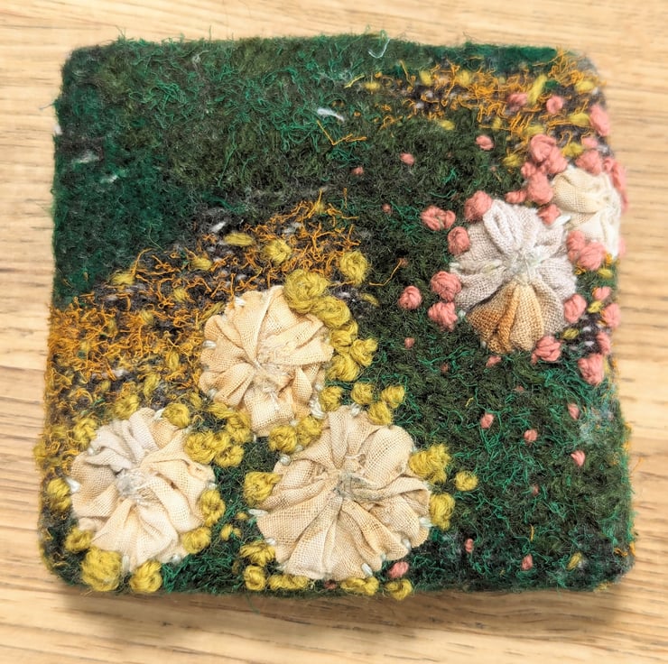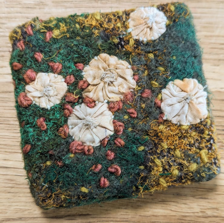 Unique piece of textile art, perfect for nature lovers. Embellished and embroidered recycled fabric inspired by woodland textures in a palate of greens with hand appliqued fungus motifs made in rust and eco dyed fabrics.