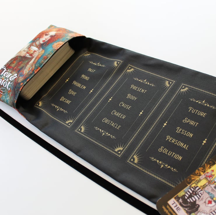 Our beautiful Tarot Card Wrap is the perfect place to store your tarot deck. It also doubles as a Tarot Reading Cloth, allowing you to do 3 card readings whether at home or while travelling. The wrap is secured by a Velvet strap, keeping your cards clean and safe.