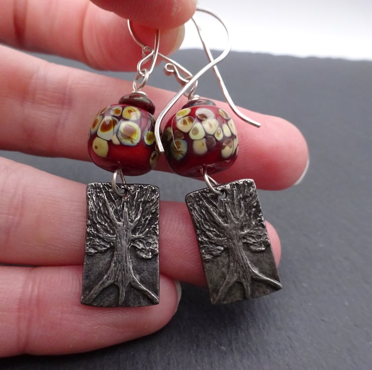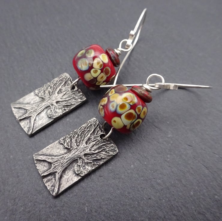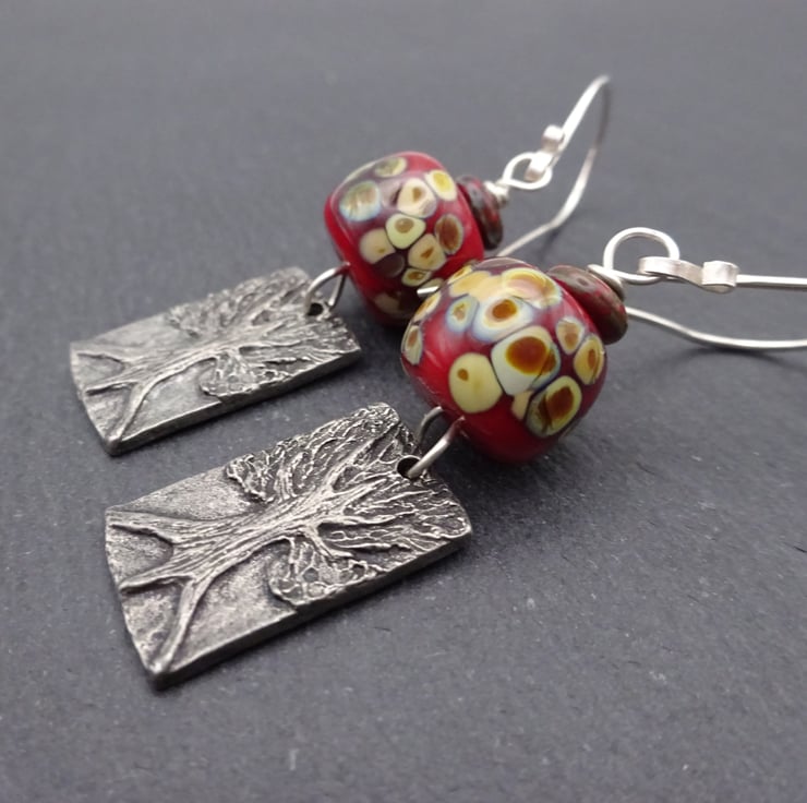 A pair of earrings made with handmade sterling silver ear wires, handmade lampwork glass beads made with red and brown glass and a pair of handmade pewter tree charms.