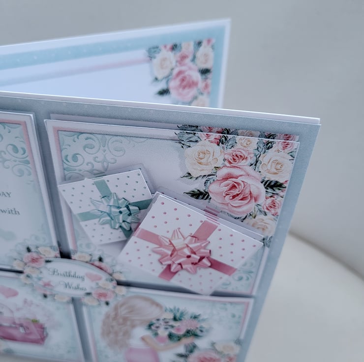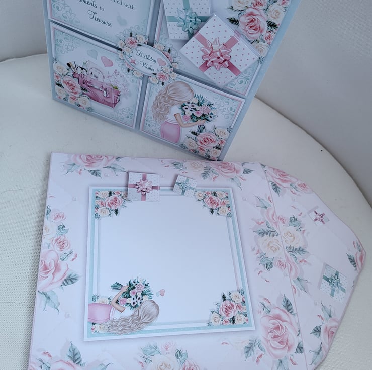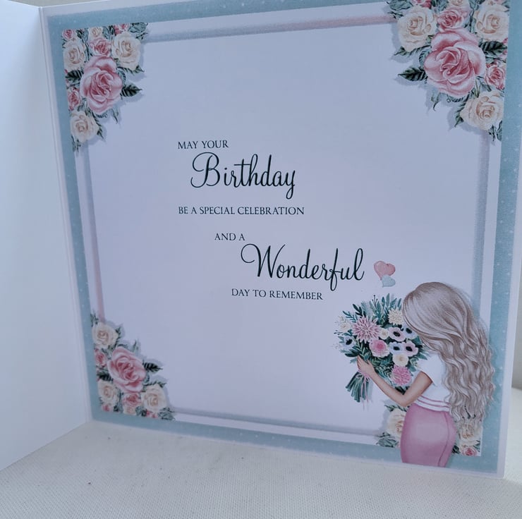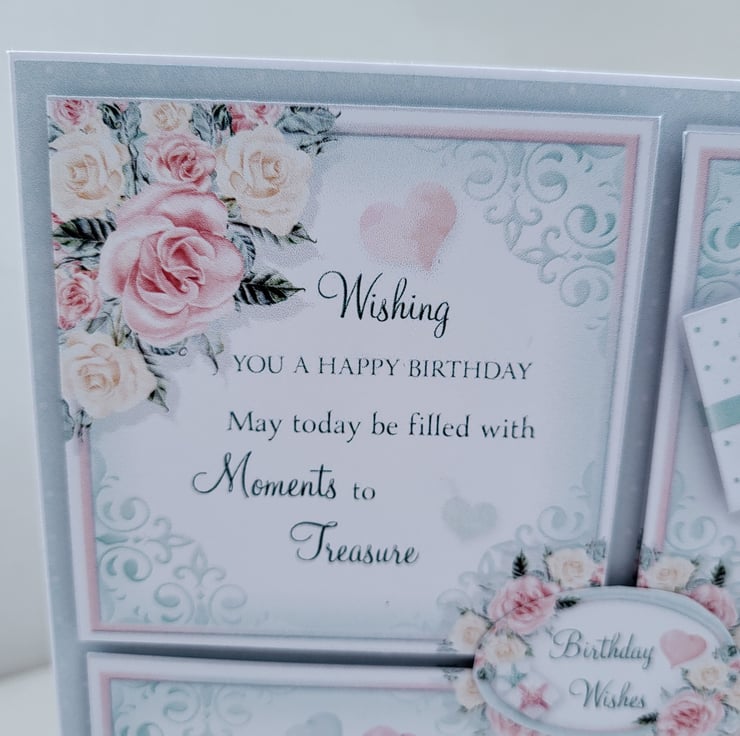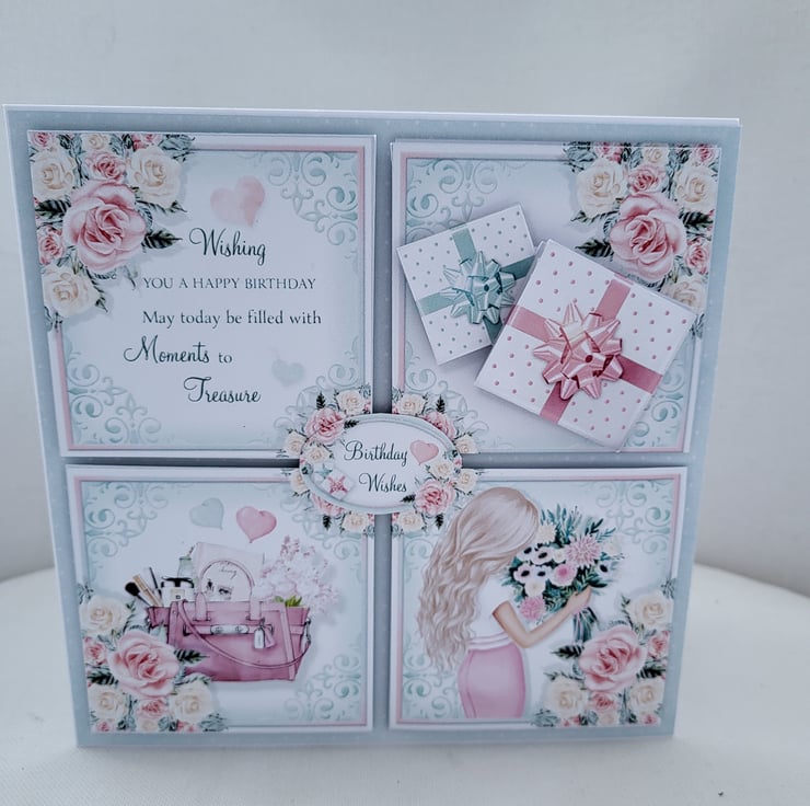 Lovely handmade birthday card suitable for a lady. The card measures approx 7 x 7 inch. On the front it reads 'Wishing you a happy birthday. May today be filled with moments to treasure '