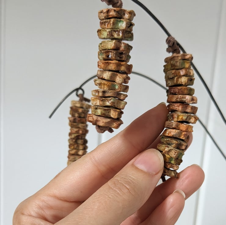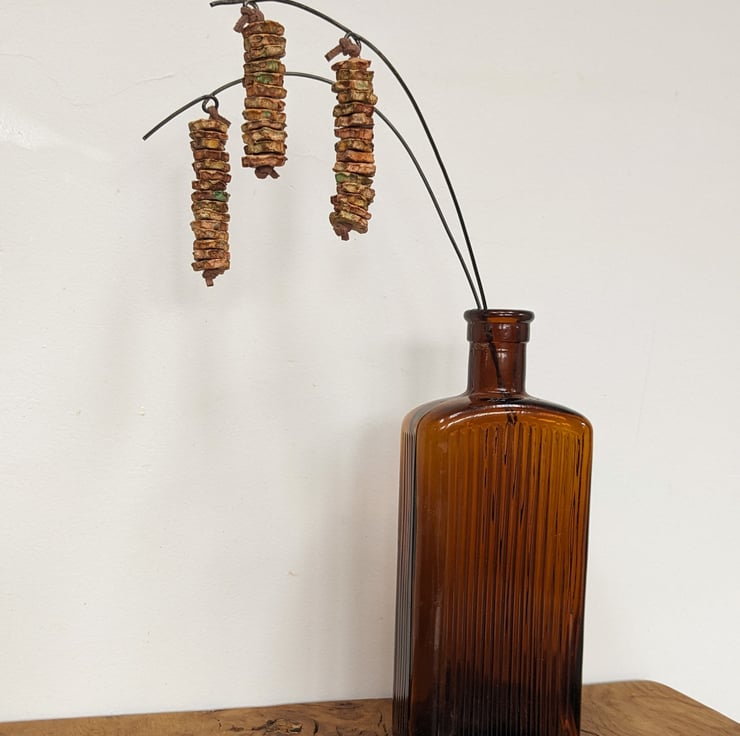 Ceramic catkins consisting of two stems (three catkins). The catkin flowers are individually sculpted in stoneware clay, bisque fired, then painted in autumnal shades of underglaze, before being re-fired, threaded on to faux suede cord and tied to the wire stems. The catkins therefore have a lovely articulated movement when they are touched and bob gently in the breeze. They look lovely in fresh, dried or artificial flower arrangements and can be combined with my stained glass flowers to great effect; see my 'Autumn Days' bouquet for inspiration, or a ready-made gift.