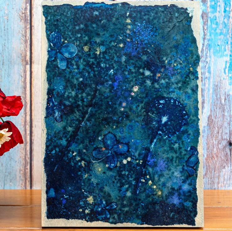 I used splashes of Winsor & Newton Gold Ink during the Cyanotype development process to give it a touch of sparkle! I also used some sprinkles of Herbin Encre Violette. I used salt in the wet cyanotype process, because this creates a wonderful crystalising effect, as well as a spritz of vinegar, to lighten the shade of blue in the final print.