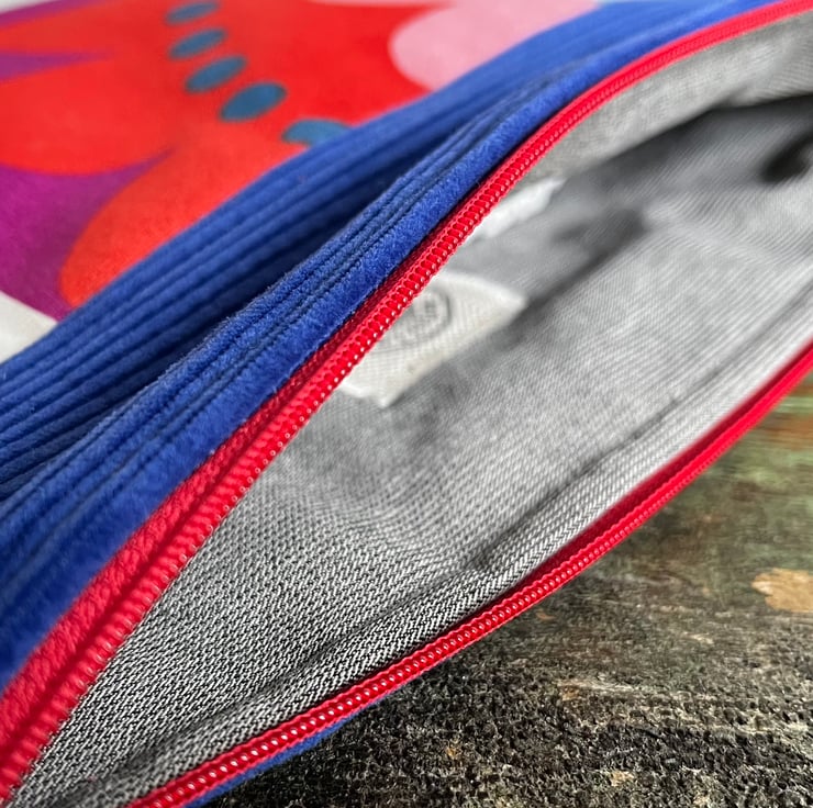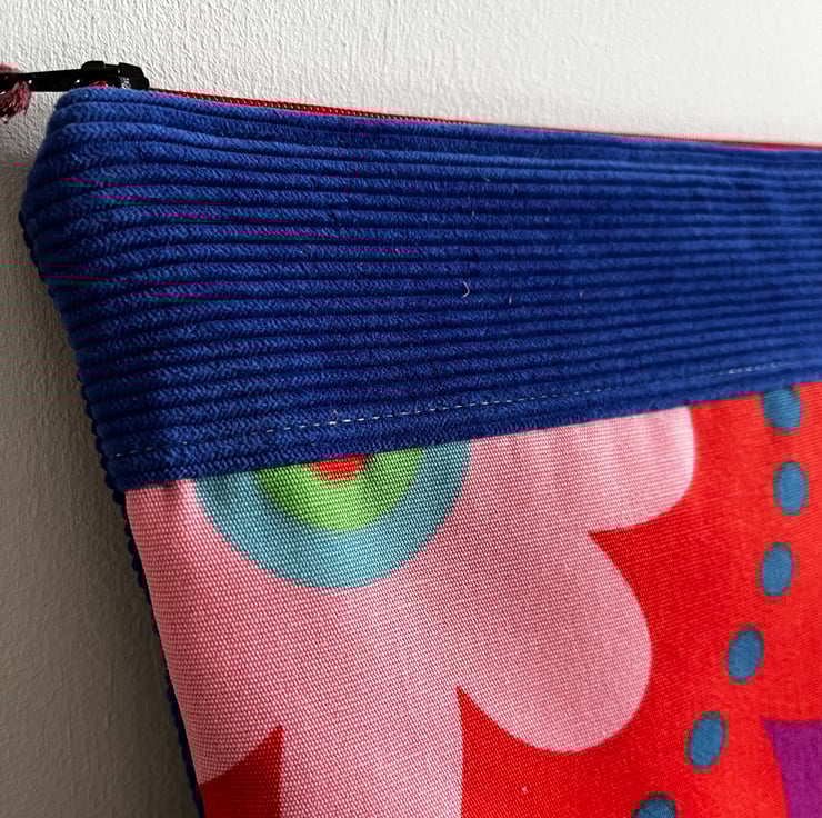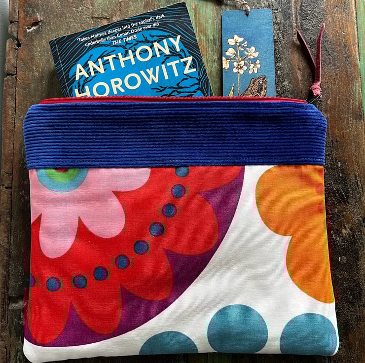 One of a kind zip pouch made from bright ikea cotton with a bold retro floral design and royal blue corduroy. It is fully lined in soft grey fabric. The pouch is a great size for a paperback book, purse and phone. It could also be used for small craft projects or cosmetics.