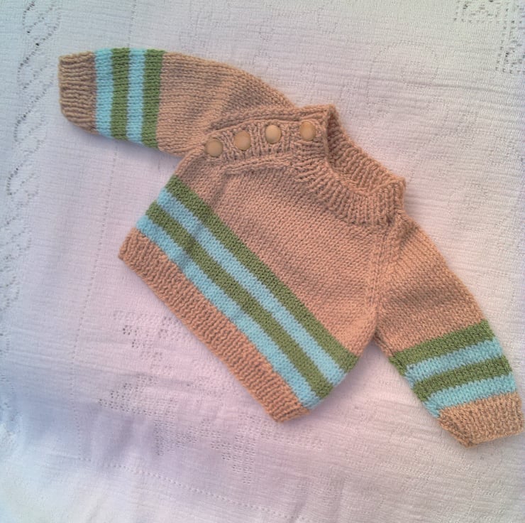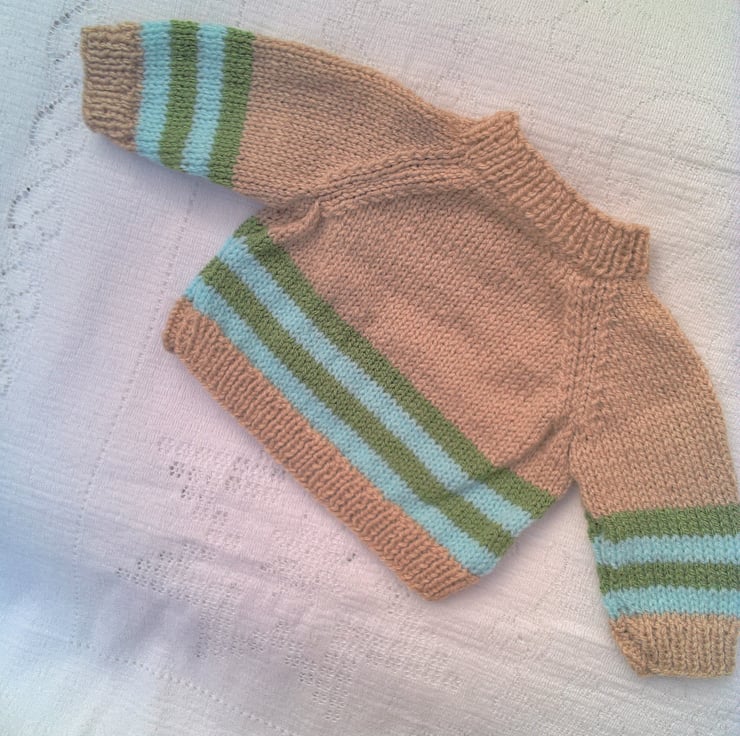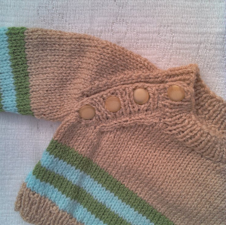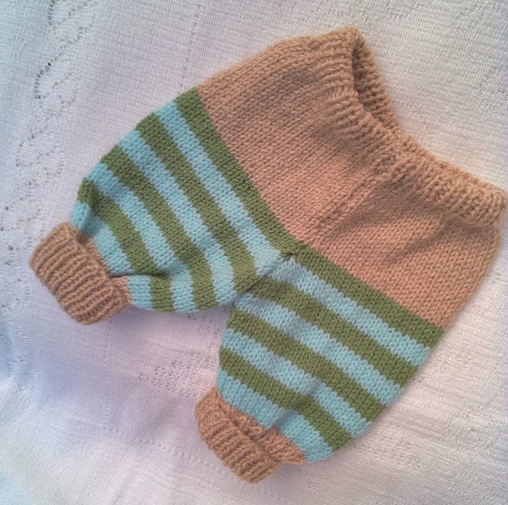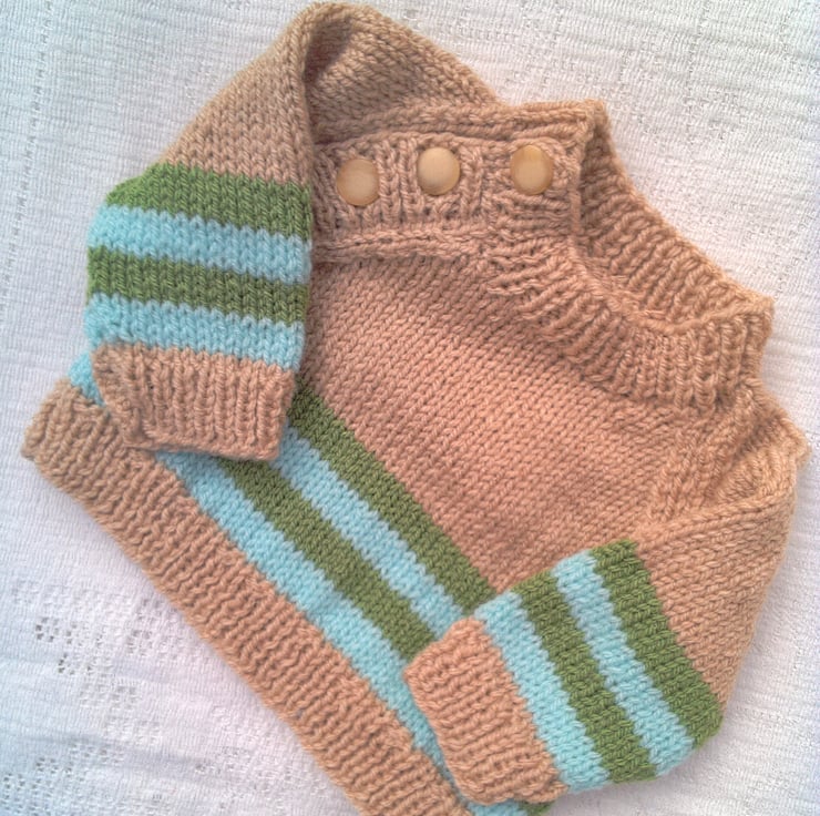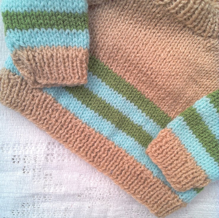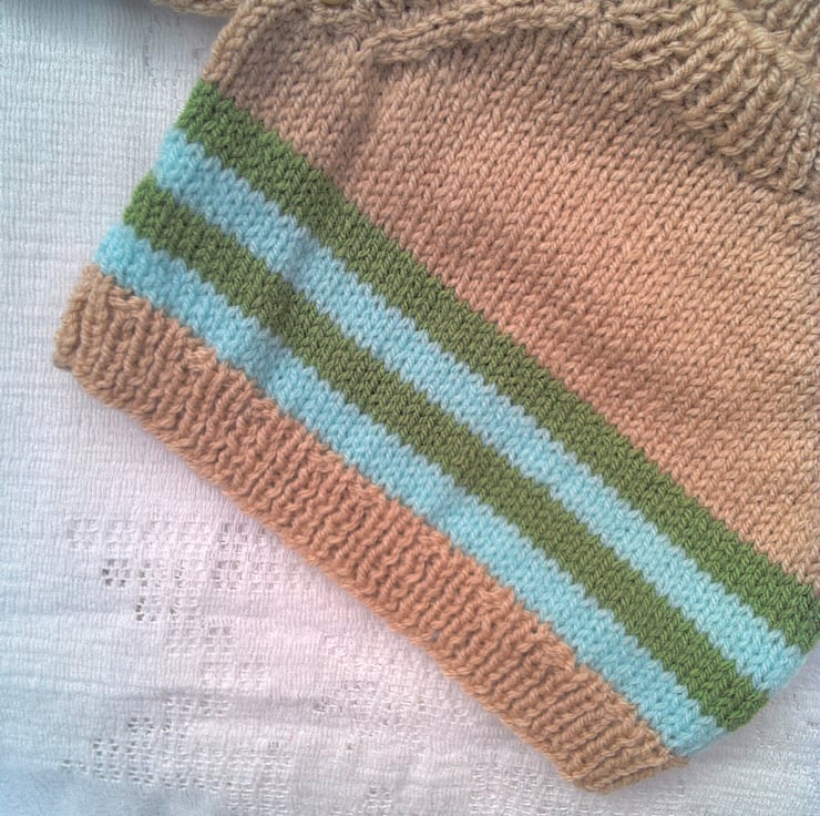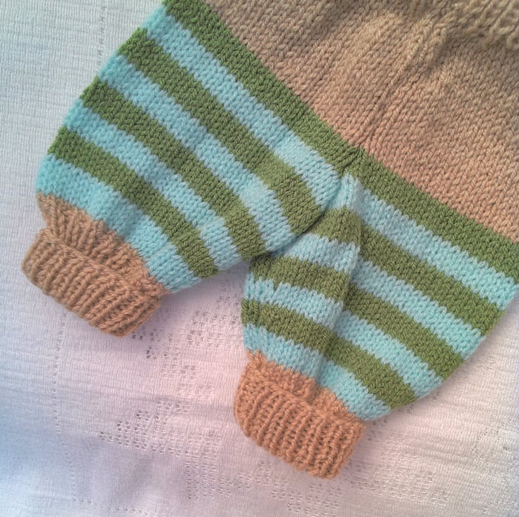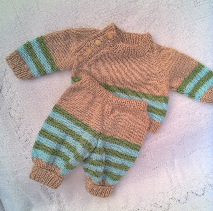 A cute and practical outfit for a baby comprises a pair of trousers and a jumper. It is hand knitted in biscuit, pale green and grass green double knitting weight yarn. The set would make an ideal gift for a new baby or a baby shower or a lovely treat for your own little one.