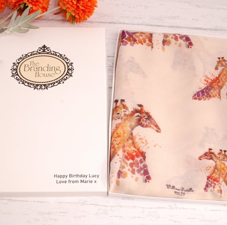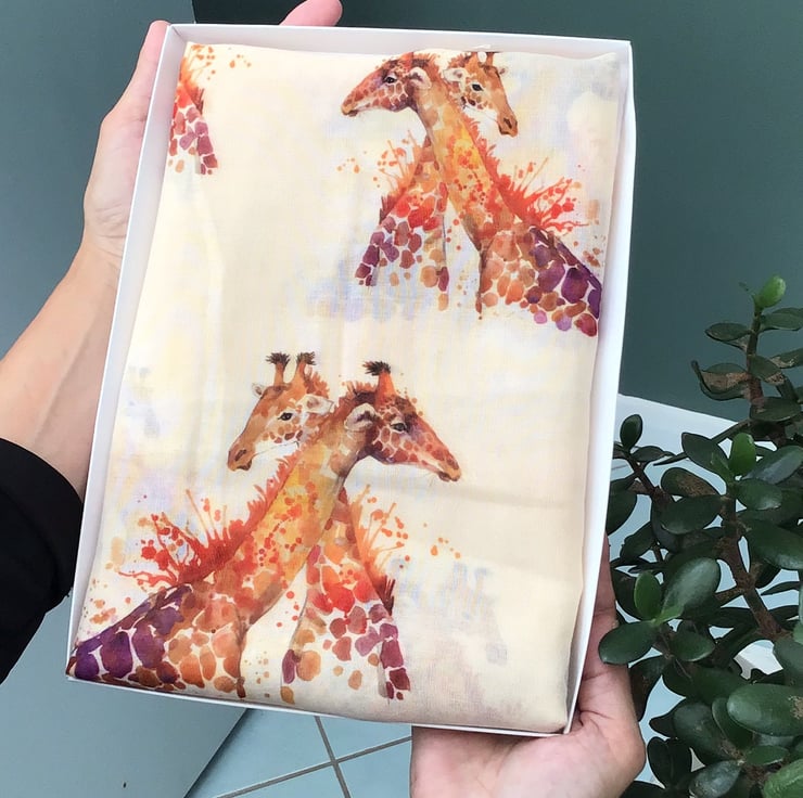 Hand printed by us in the UK, all our scarves are presented in a gift box with the option of adding a personalised message to the gift box lid at no extra cost.