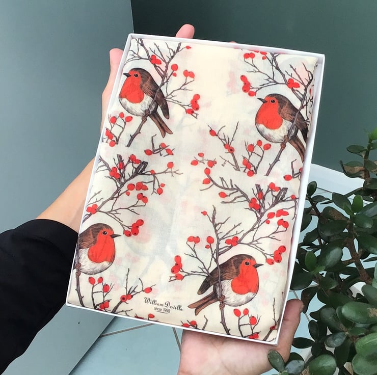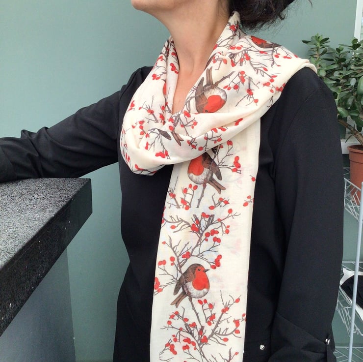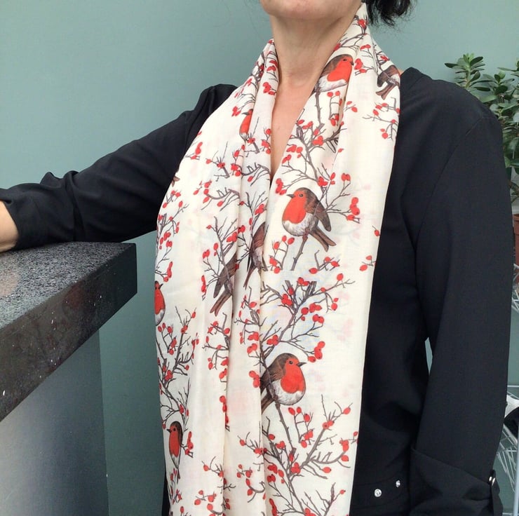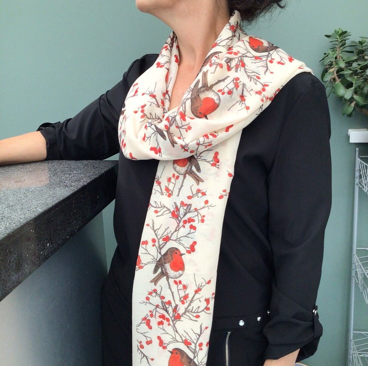 Featuring a beautiful Christmas Robin print, these stunning scarves are all hand printed to order and carefully designed to ensure the images always appear the correct way up when worn.