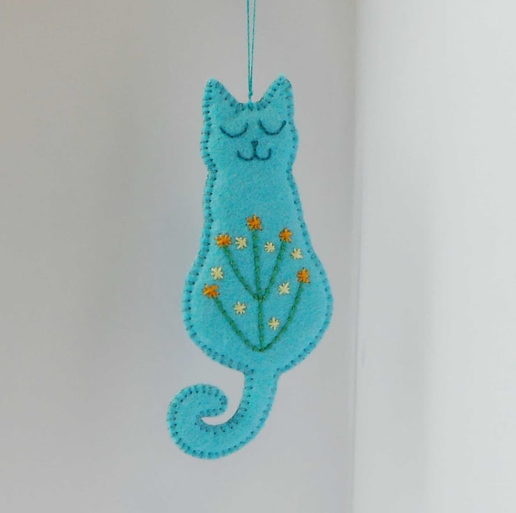 Smiling cat hanger in turquoise felt with embroidered tummy