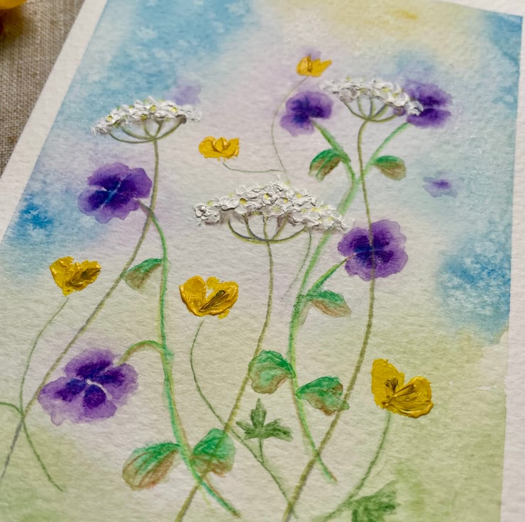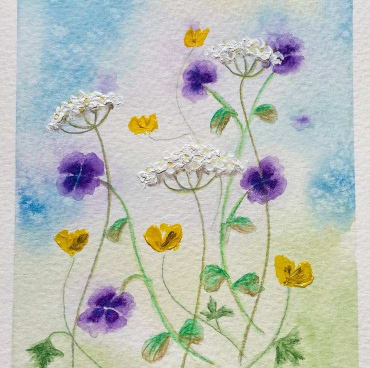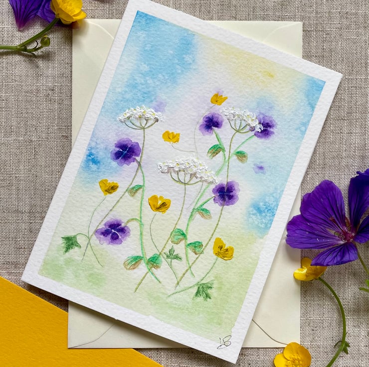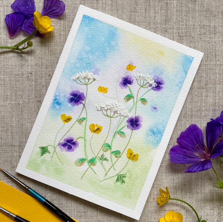 This hand painted blank card features a wash of blues and green background with some tiny geranium, buttercup and cow parsley flowers, inspired by my little wildflower garden, painted in artists quality watercolour paint onto 300gsm watercolour paper and enhanced with a little acrylic paint onto the cow parsley and buttercups to add texture, the card has been left blank for any occasion and would make a lovely card for a spring birthday, Mother's Day, or just sending a pretty note to a friend.