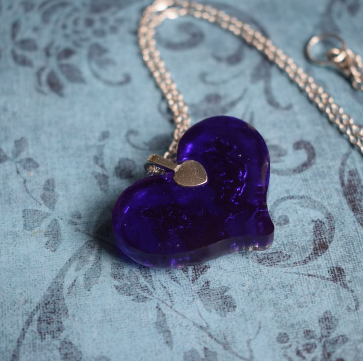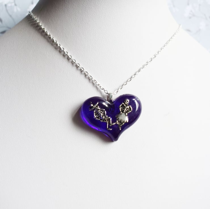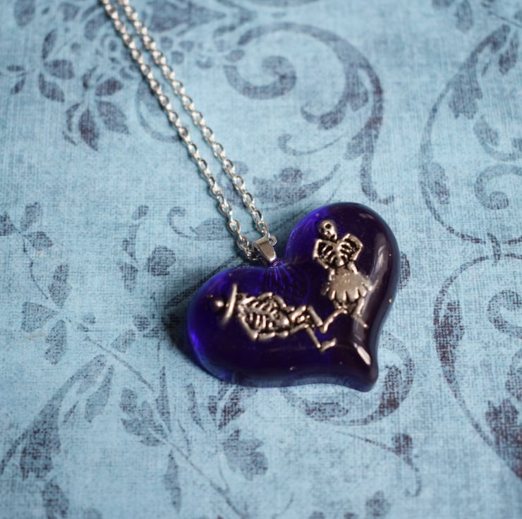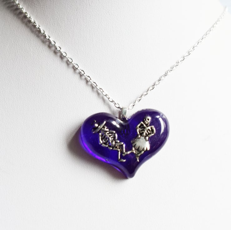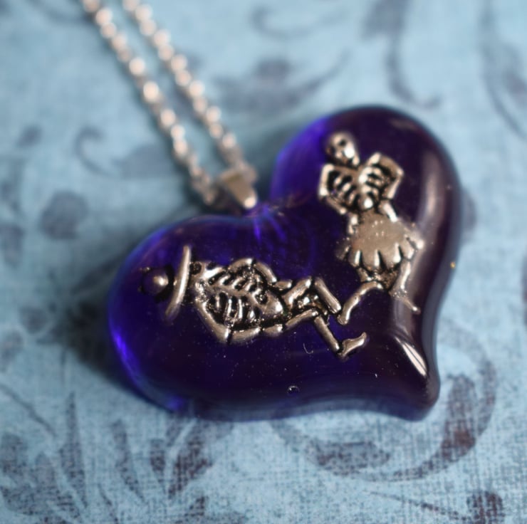 The purple resin heart has been inlaid with a dancing skeleton couple happily dancing away to celebrate The Day of the Dead or Dia de los Muertos. The heart is around an inch and a half across at its widest point and an inch high.