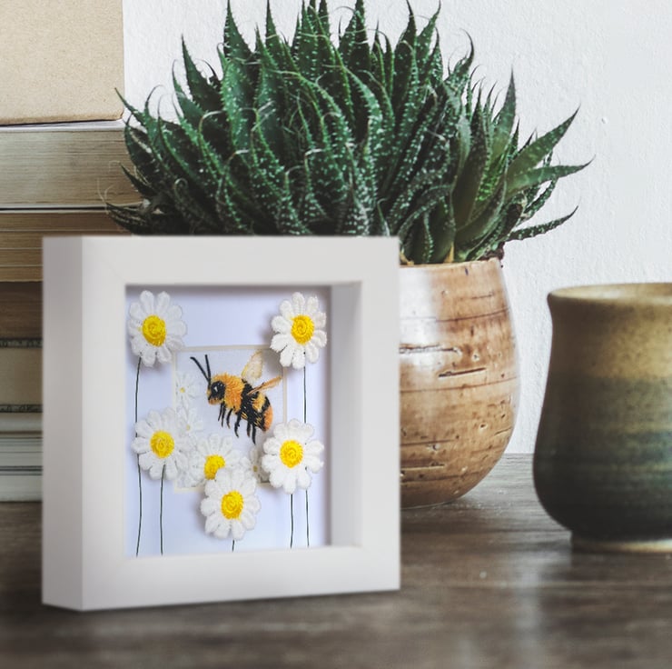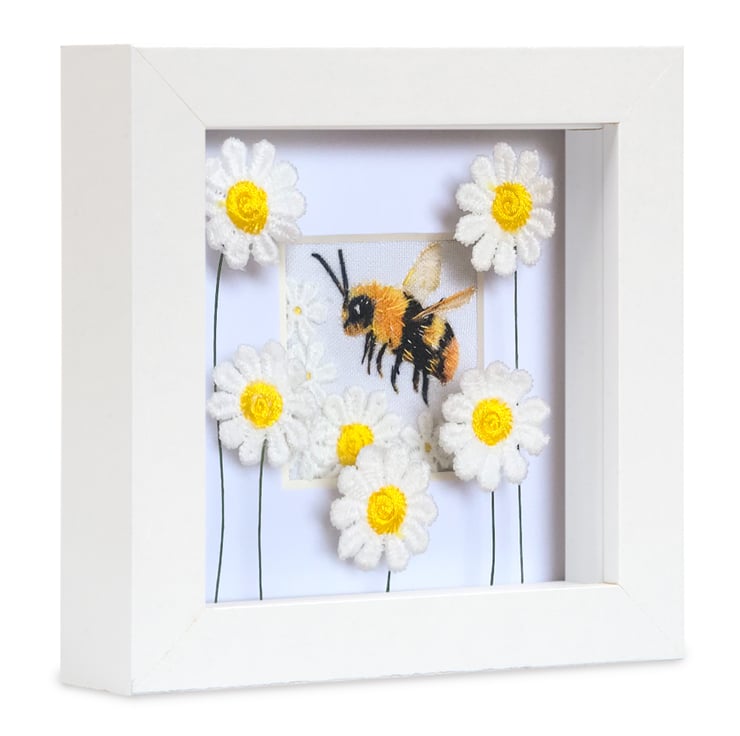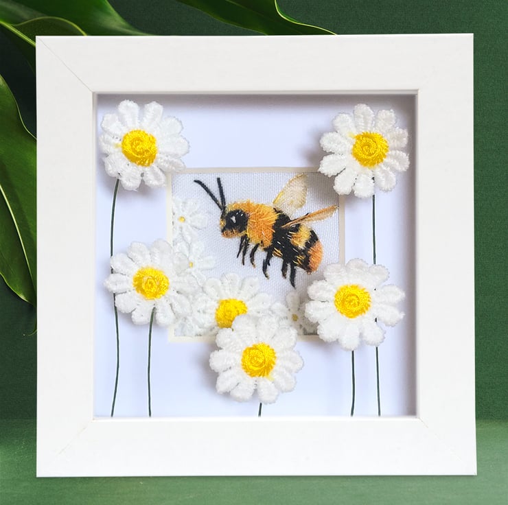 Bee picture, bee with daisies textile art, bee gift