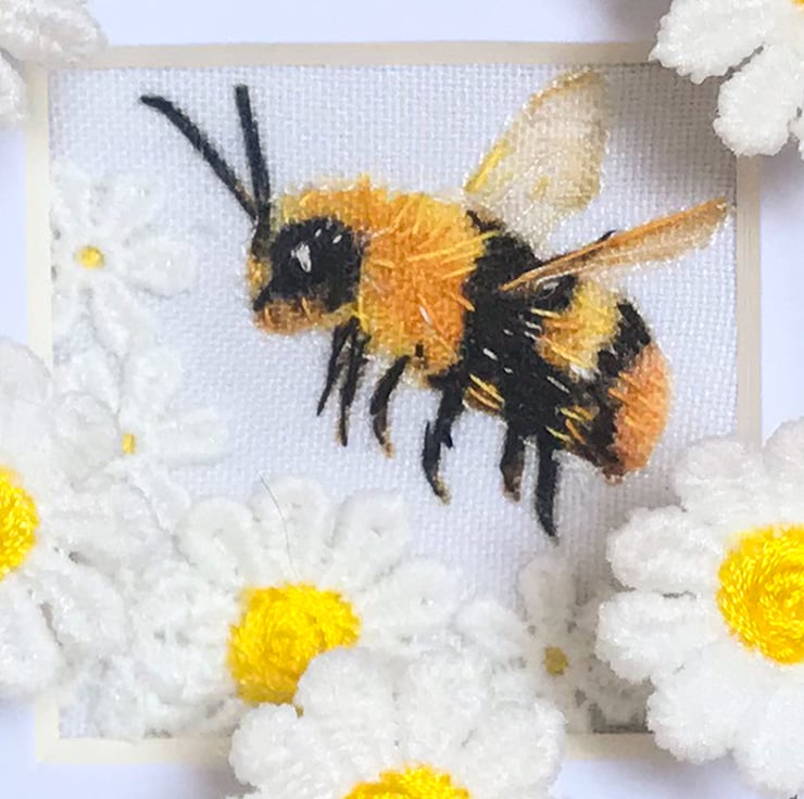 I have stitched the details of the bee with hand-embroidery and added fabric flowers. There are daisies on wires in the foreground, for an extra three dimensional effect.