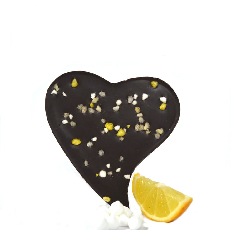 - Smooth Belgian 70% dark chocolate 'heart shaped' gift bar flavoured with natural Sicilian lemon oil extract