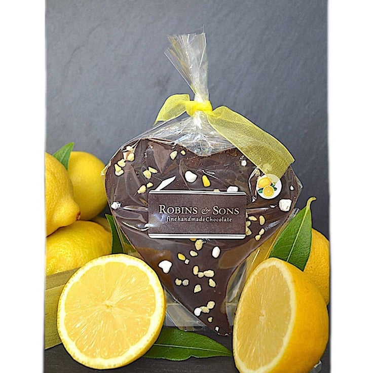 - Smooth Belgian 70% dark chocolate 'heart shaped' gift bar flavoured with natural Sicilian lemon oil extract
