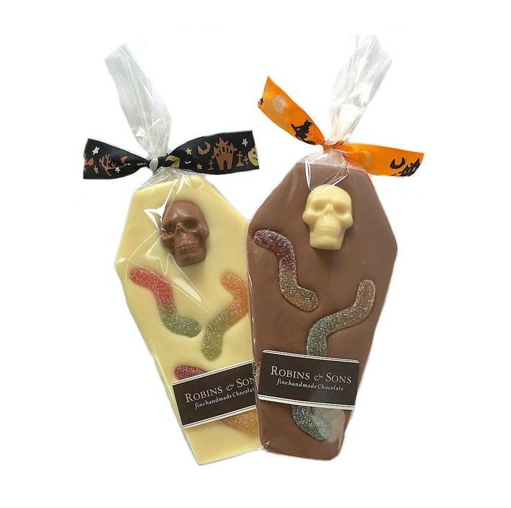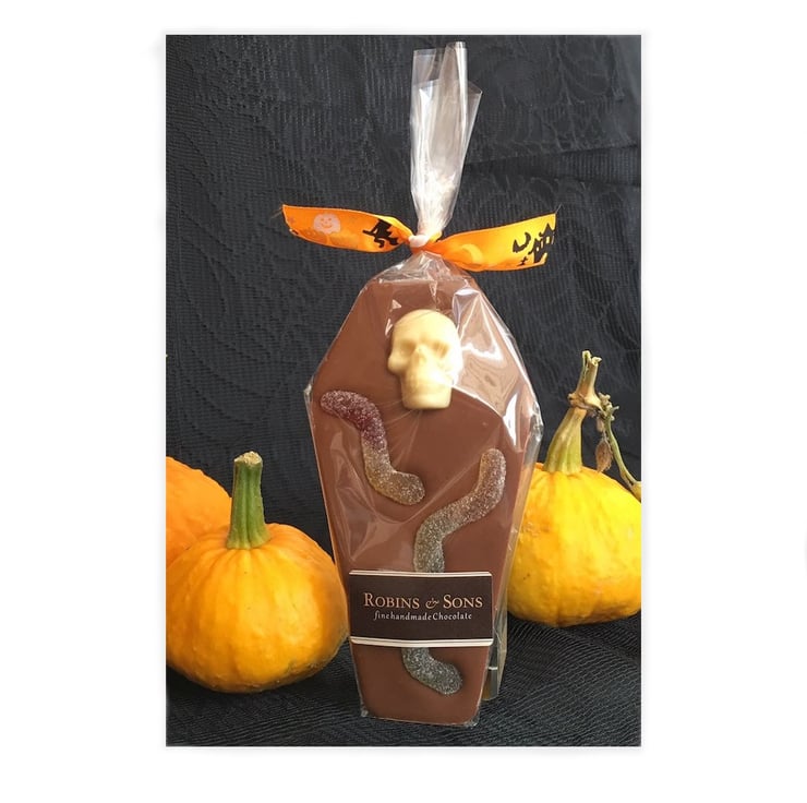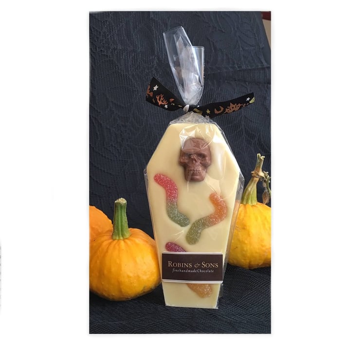 Flat 'coffin shaped' novelty chocolate bars, made from delicious Belgian milk and white chocolate complete with ghoulish toppings and a 'spooktacular' decorative orange and black Halloween ribbon.