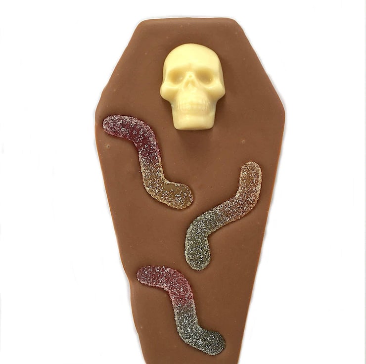 Ghoulish fun with our novelty chocolate coffin bar complete with chocolate skull and fizzy fruit flavoured jelly worms.