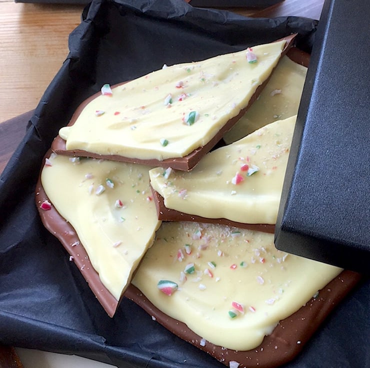 Delicious milk and white layered chocolate, infused with natural peppermint oil and mint candy cane nibs. Also known as Peppermint Bark and served in the same way i.e. made in one giant slab then cracked into portion size pieces and packed.