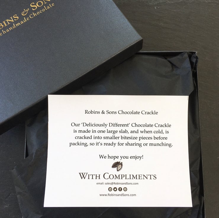 Take time to savour life's little luxuries, gently remove the ribbon, carefully lift the lid and slowly peel back the 'Robins & Sons' seal to reveal the chocolatey deliciousness inside, and then tuck in!