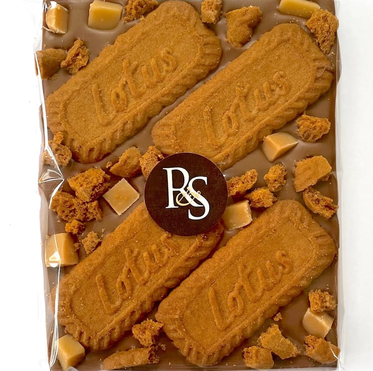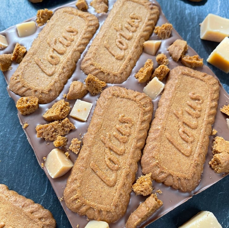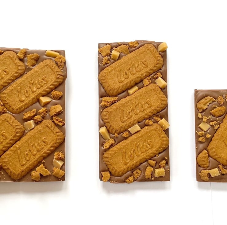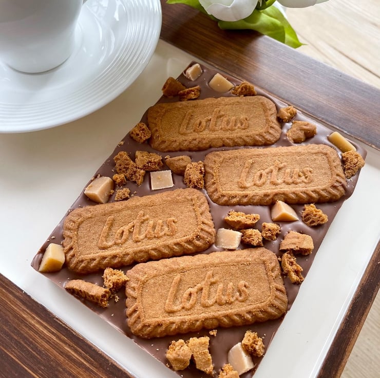 Not your average chocolate bar, this thick slab of creamy Belgian milk chocolate is topped with whole Biscoff lotus biscuits, vanilla fudge chunks and an extra sprinkling of lotus biscuit pieces for a delicious, crunchy and moreish mouthful.