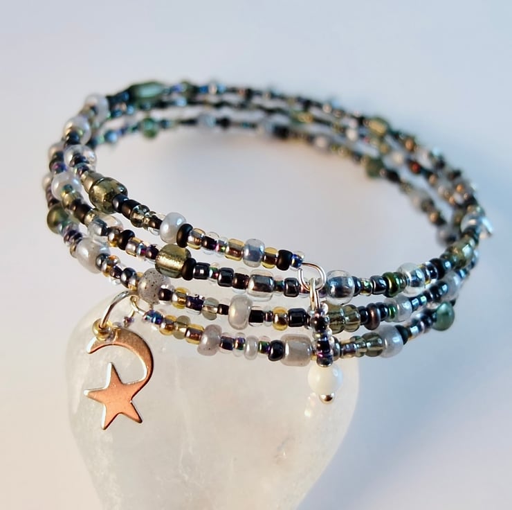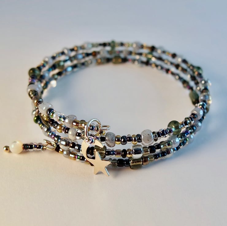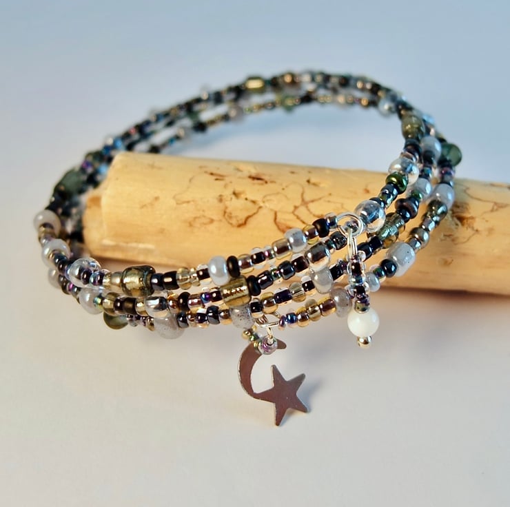 At one end I have attached a mother of pearl and seed bead charm, at the other end an aluminium half moon and star charm.