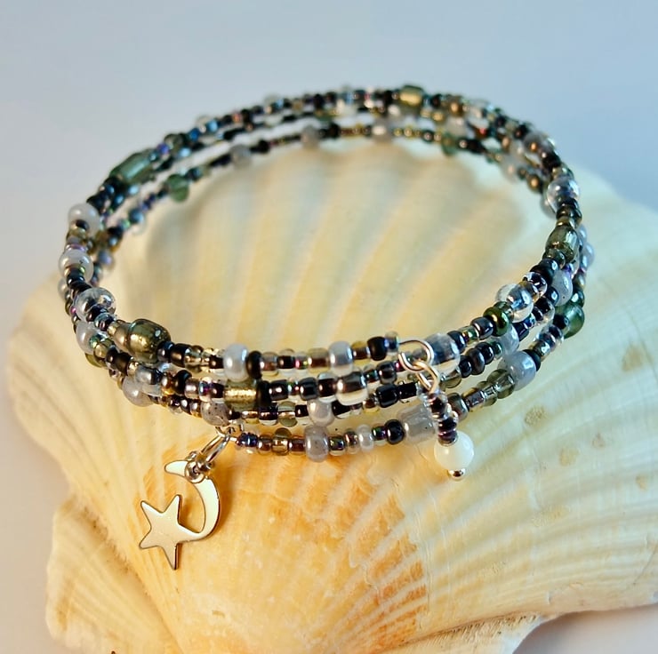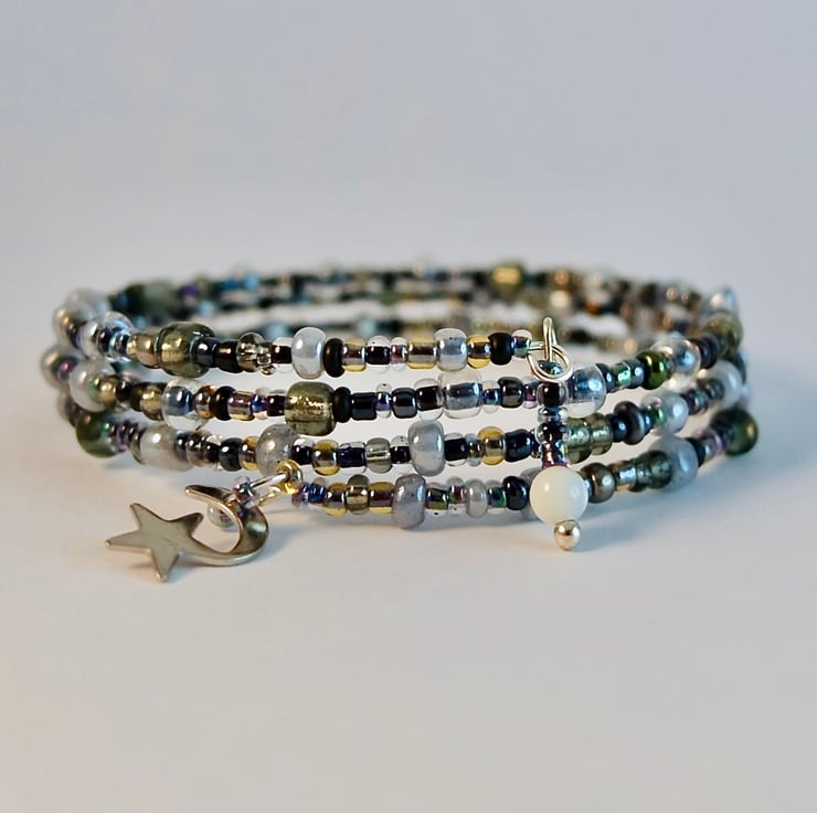 Wrap bracelet made using three tiers of memory wire threaded with an assortment of shapes, sizes and colours of Czech glass seed beads.