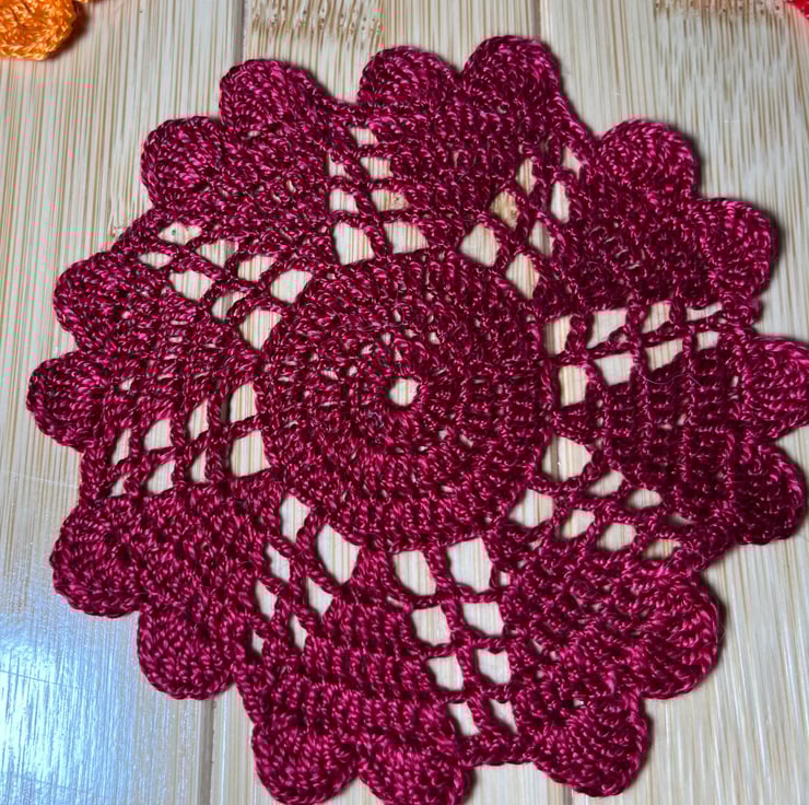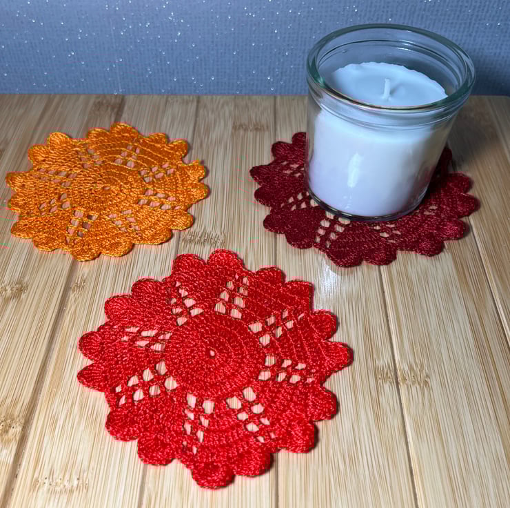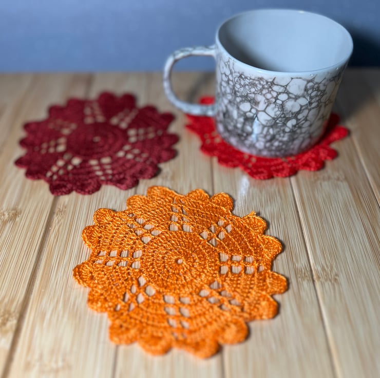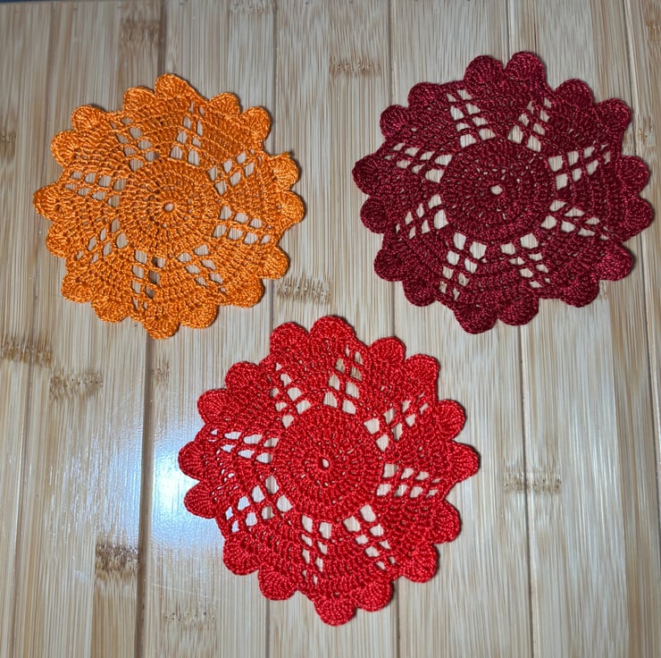 Add a touch of shabby chic charm to your decor with this set of three crochet doilies, each approximately 10cm in diameter.