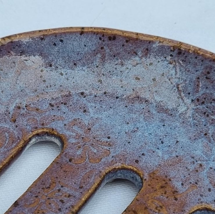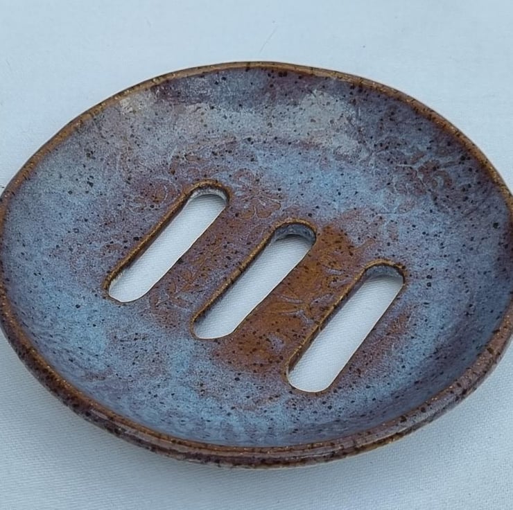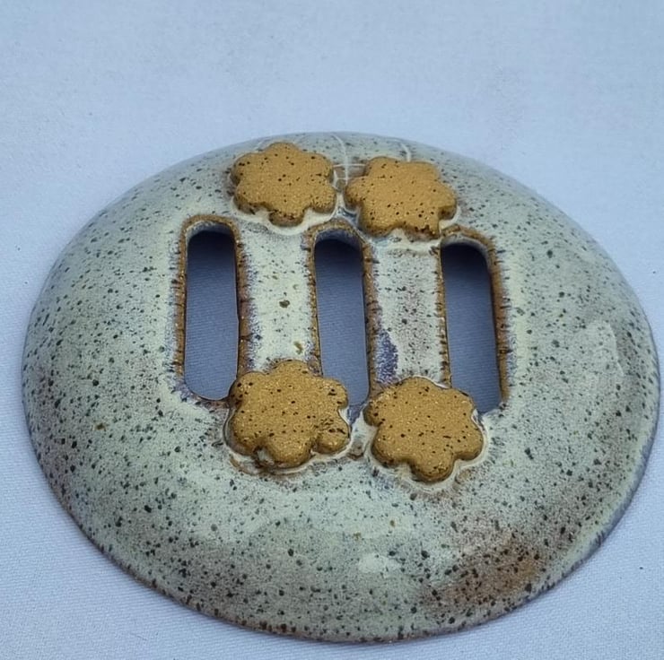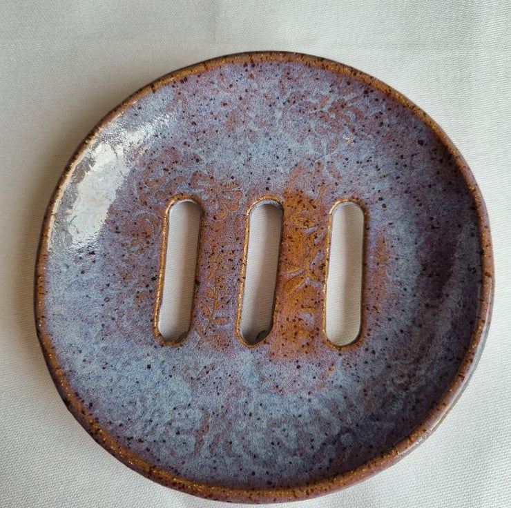 Ceramic Soap Dish Handcrafted with Floral Design: This round soap dish has a floral texture. The design includes three elongated drainage slots in the center, ensuring that your soap stays dry and lasts longer. Four small floral shaped disks are attached to the base to aid water drainage. The unique glaze provides a beautiful blend of lavender and cream that would make this soap dish suit any bathroom, cloakroom or kitchen. Could also be used as a sponge rest and for solid shampoo bars. Diameter approx. 5".