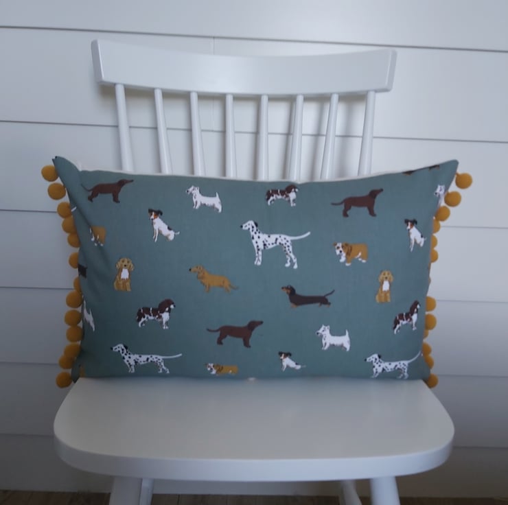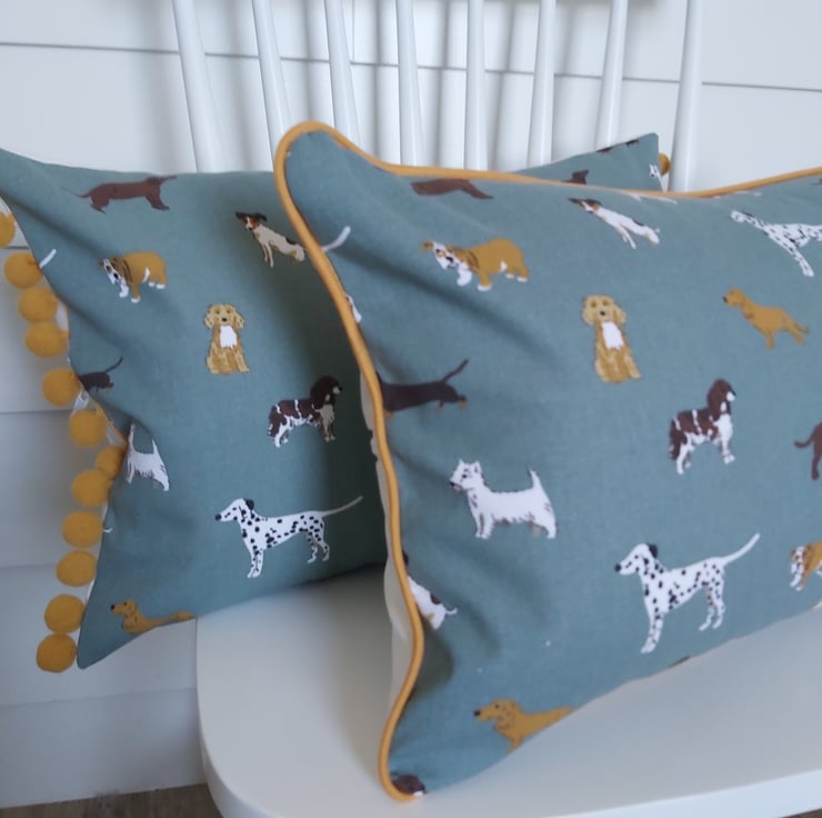 Sophie Allport fetch fabric cushion with cream back and central zip and mustard piping