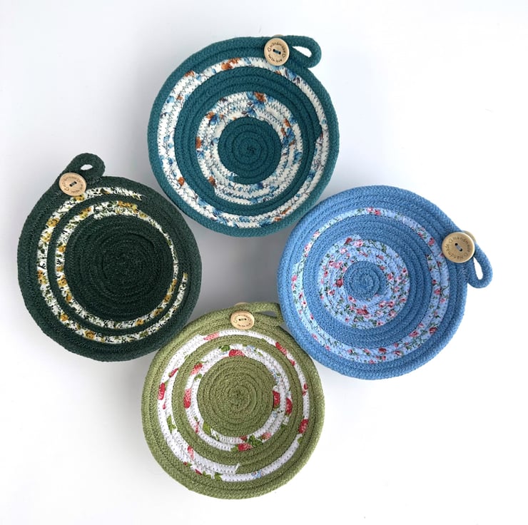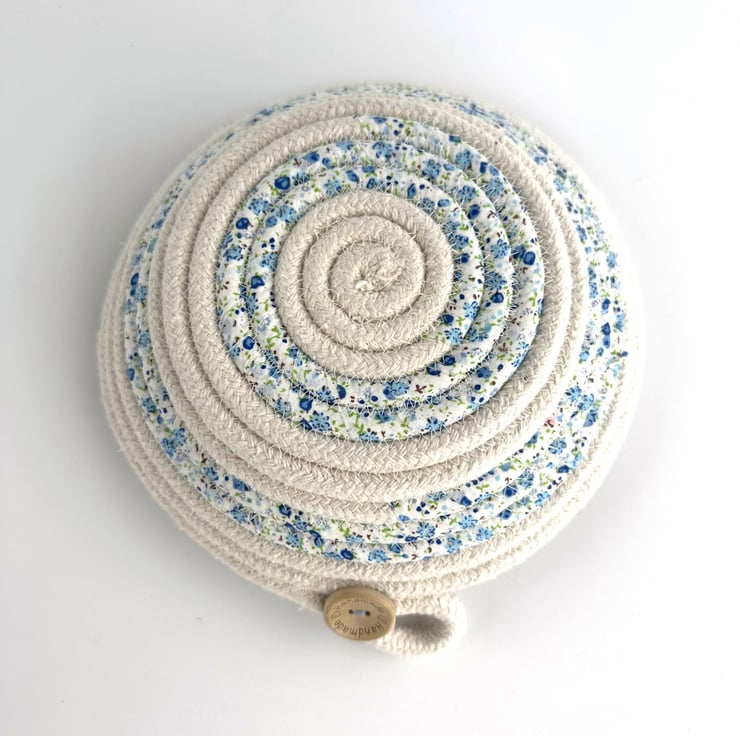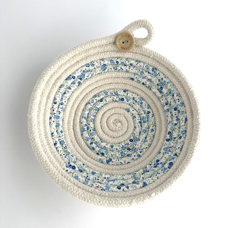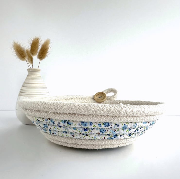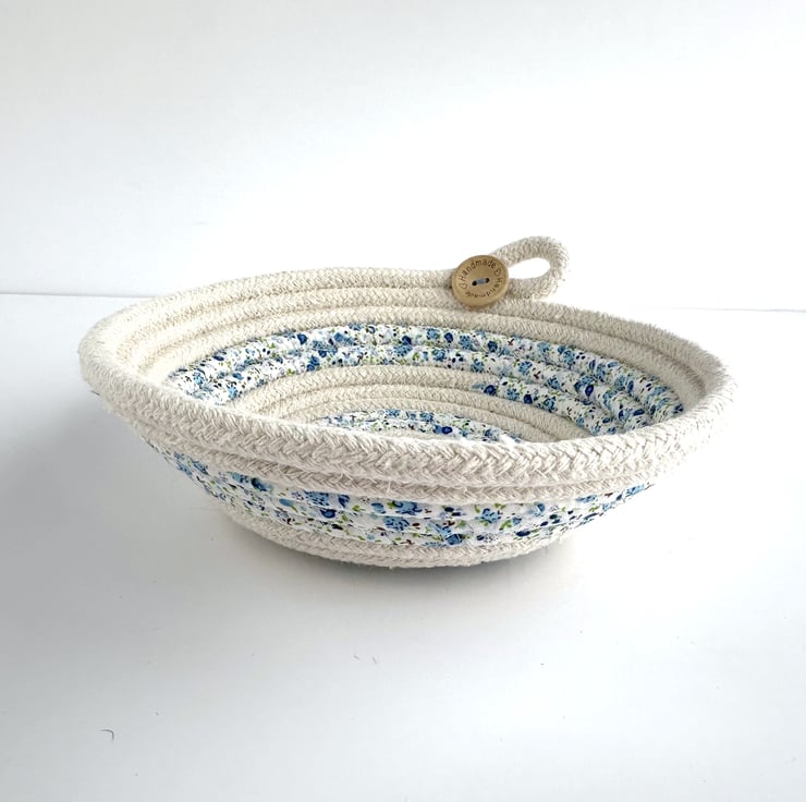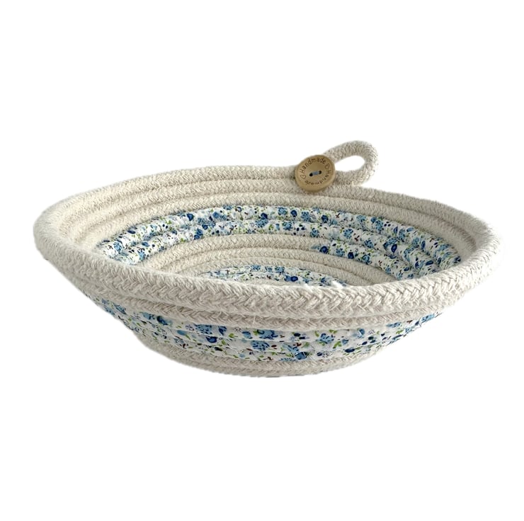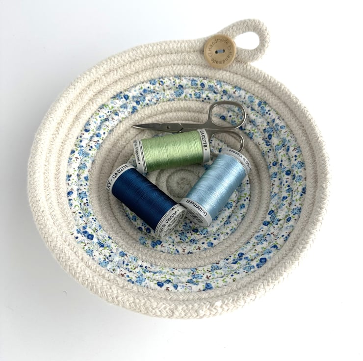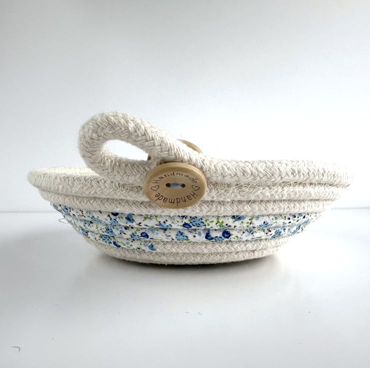 This lovely trinket bowl has been made from cotton rope, which has been coiled and machine-stitched into a bowl shape. During this process, sections of the rope have been wrapped with strips of fabric, giving a pretty striped effect to the finished dish. The rope is a natural ivory colour, and the fabric is ivory with a ditsy floral pattern in pretty shades of blue, green and touches of brown. The dish has been finished with a decorative loop and two wooden buttons, one on the inside and one on the outside of the bowl. The natural wood buttons are inscribed with the words “Handmade” and two tiny hearts.