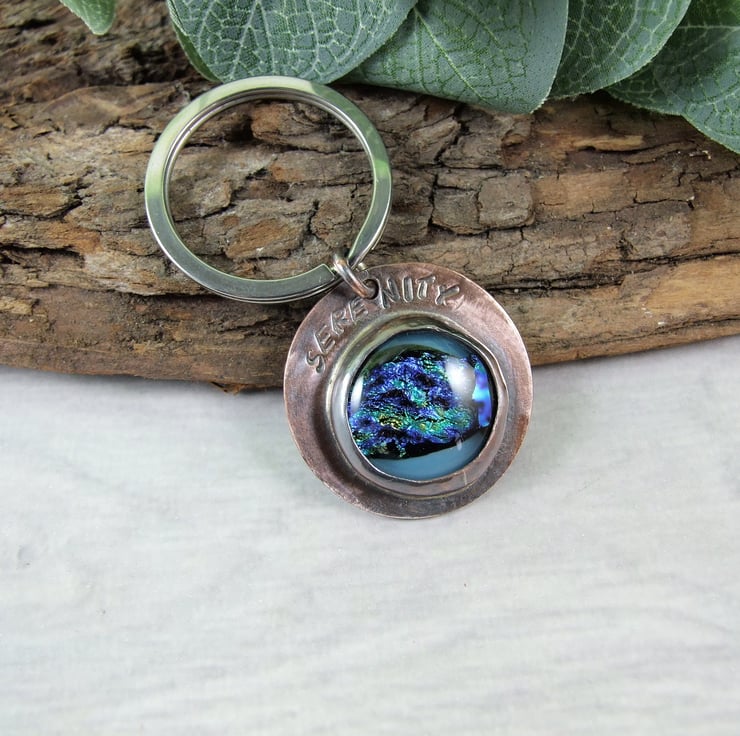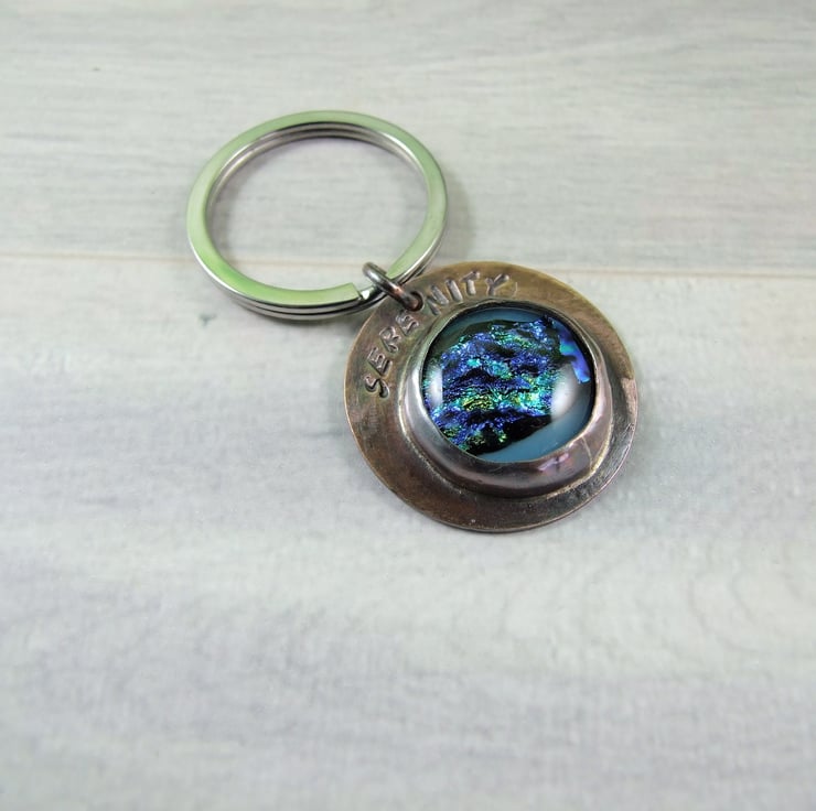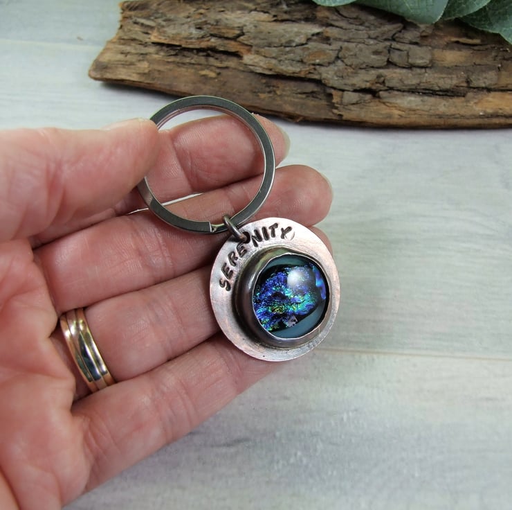 Keyring, Copper and Dichroic Glass Bag Charm. Hand stamped with serenity. 7th Wedding Anniversary Gift. Can also be worn as a pendant necklace.