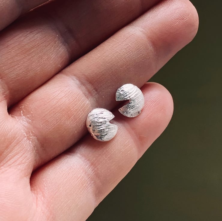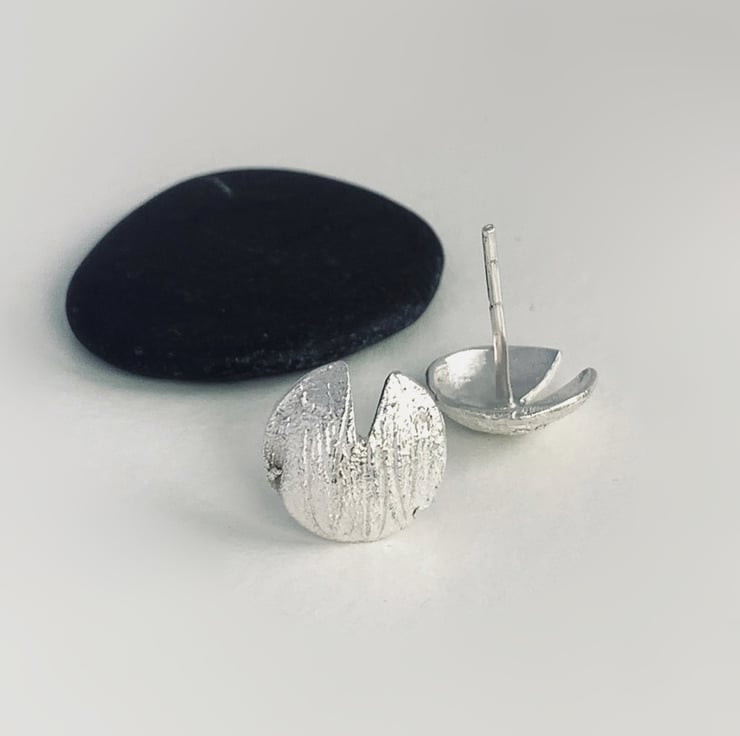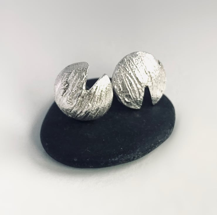 Approx 12 mm Domed studs with a little triangle section cut out. The earrings have been heavily textured. These studs are contemporary and unique design.