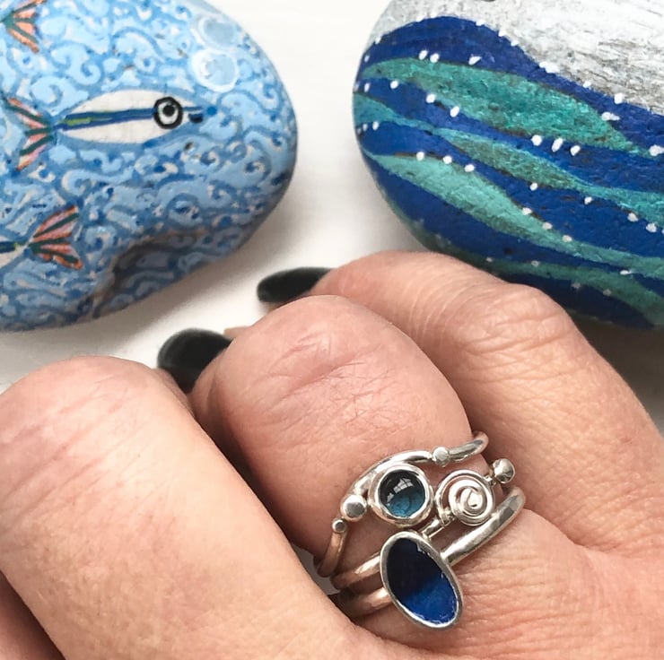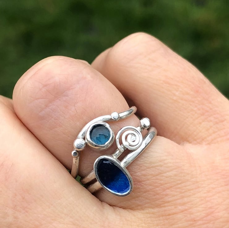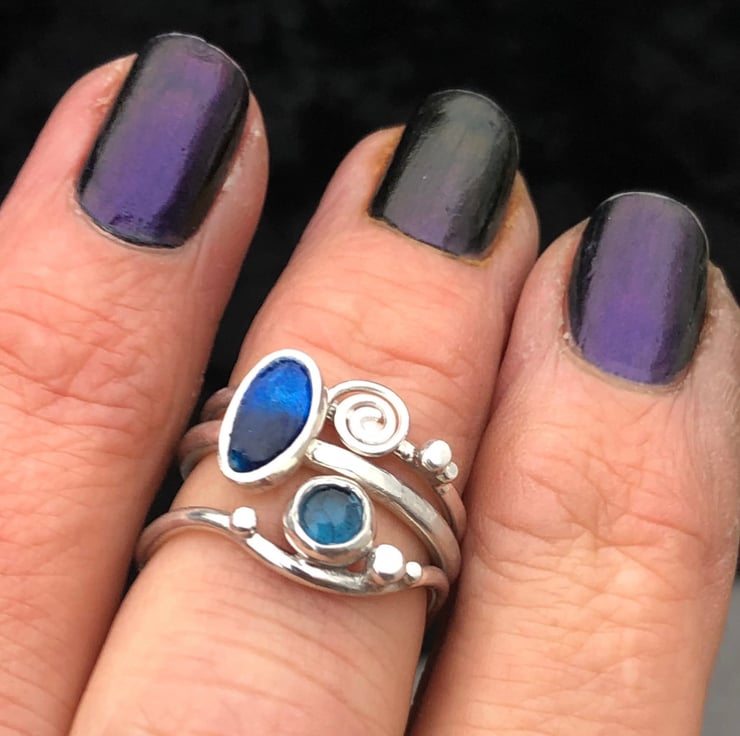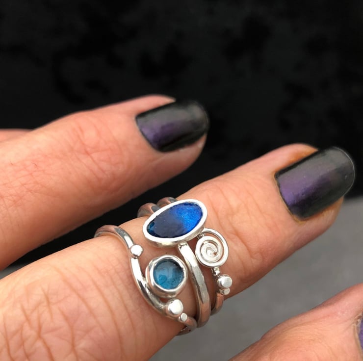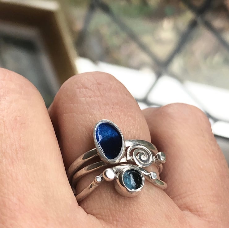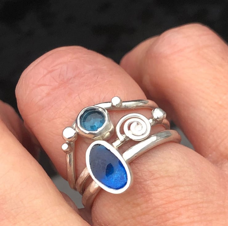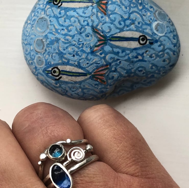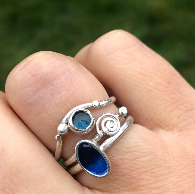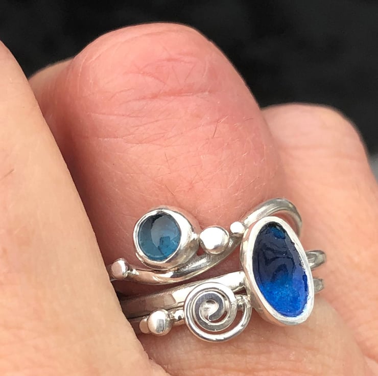 This Blue Topaz Stack Ring has been handcrafted by Michelle using Sterling and Fine Silver and features a London Blue Topaz stone and enamel. The approximate: 8mm wide ring is made of three seaside inspired rings and you can wear them any order, you wish. The first ring has a seashell and fine silver flat bubble detail. The 2nd is a blue enamelled pebble shaped ring and the 3rd is a wavy ring with a approx: 5mm wide London blue topaz and flat topped, bubble detail.