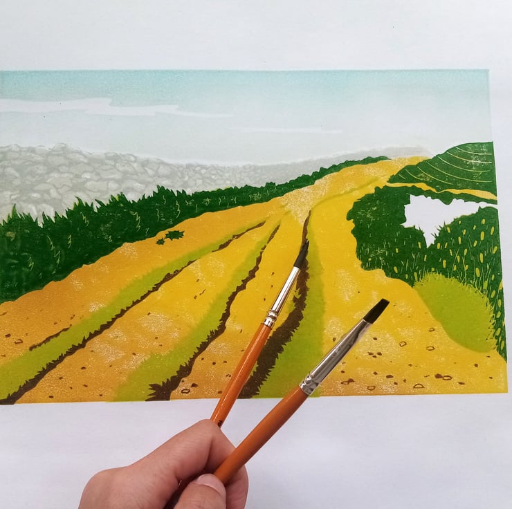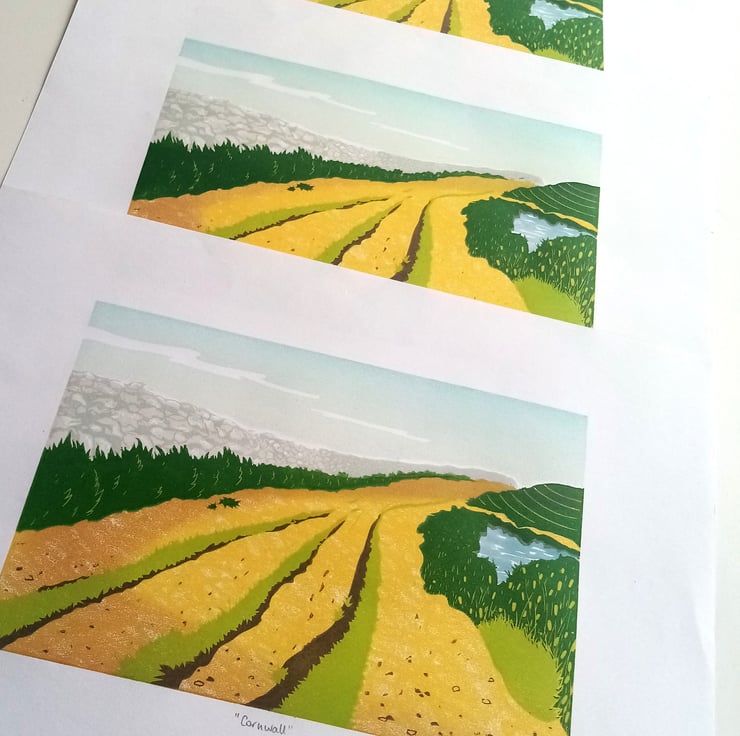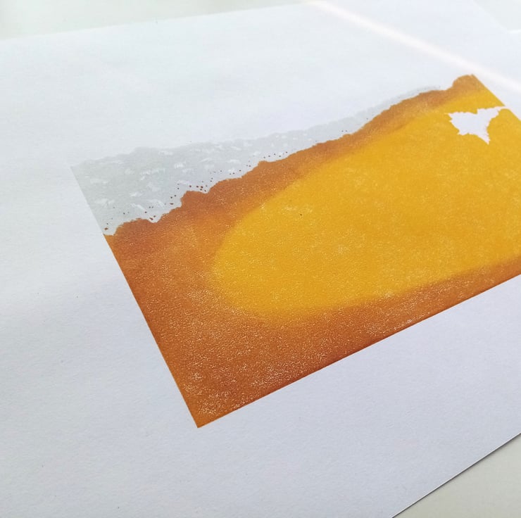 Process: reduction linocut uses only 1 lino sheet, which is carved and printed several times, overlapping each printed layer, meaning that you can't go back once an area is carved!