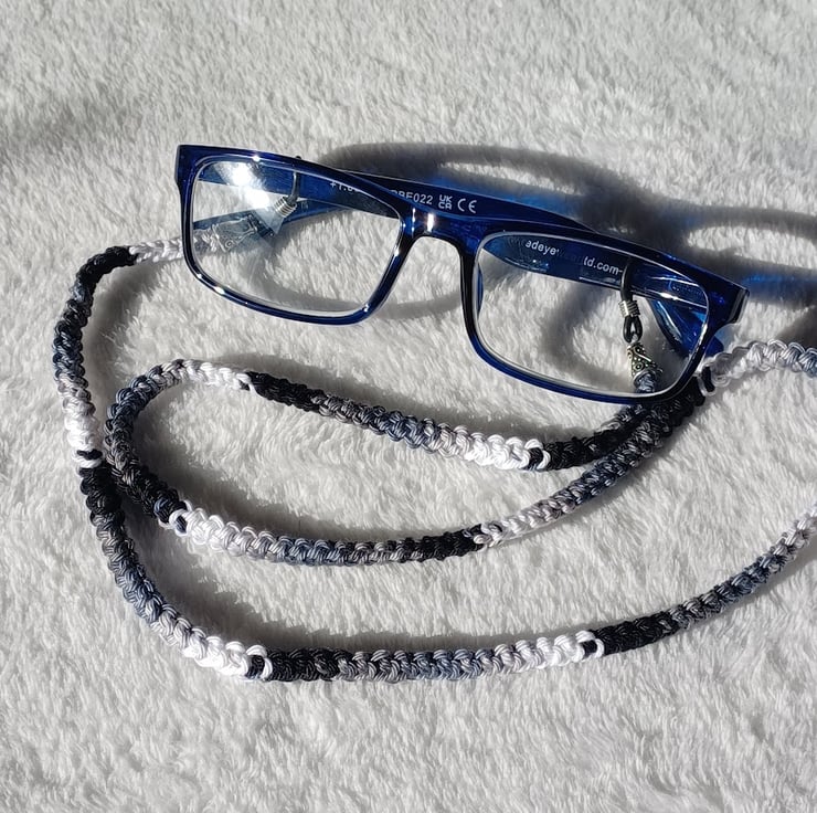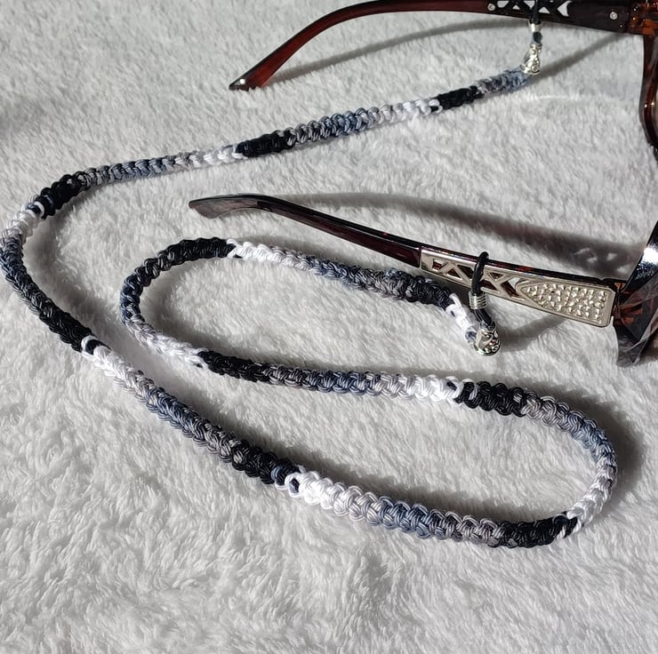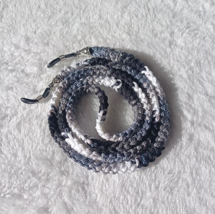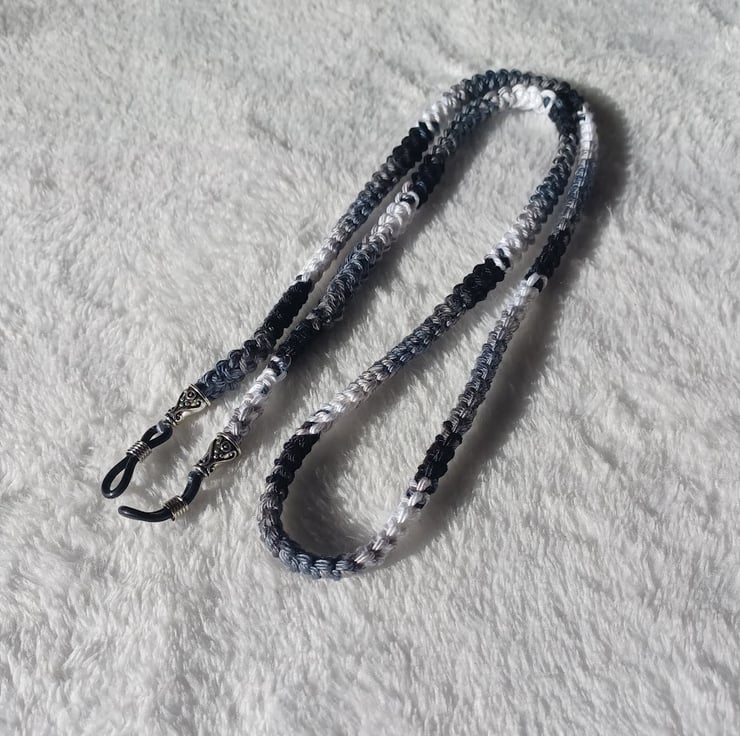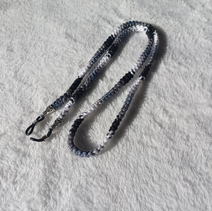 Crochet multicolour (black, grey, white) cotton cord for glasses with nice silver colour end bead and black loop
