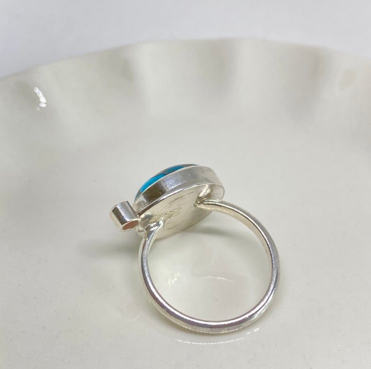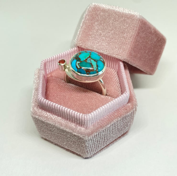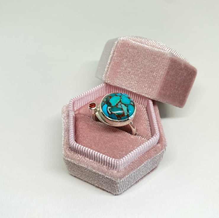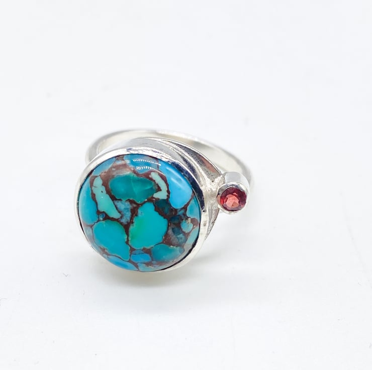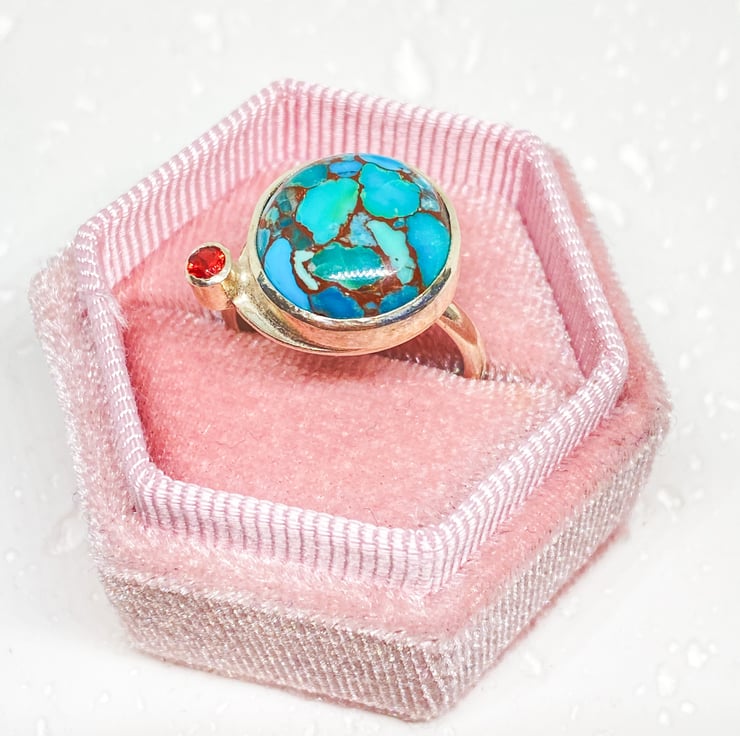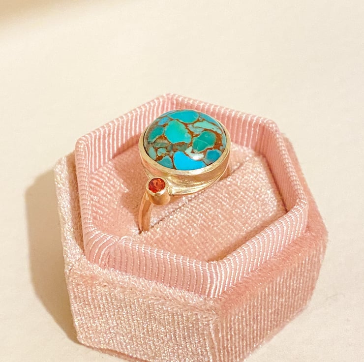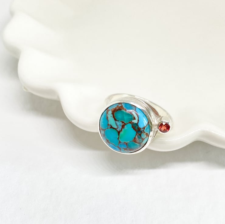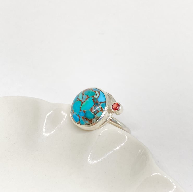 Handmade statement Turquoise and Tourmaline ring. A vibrant Egyptian turquoise stone, which is said to symbolise tranquility, paired with the healing hues of tourmaline. Handmade using traditional metal smithing techniques.