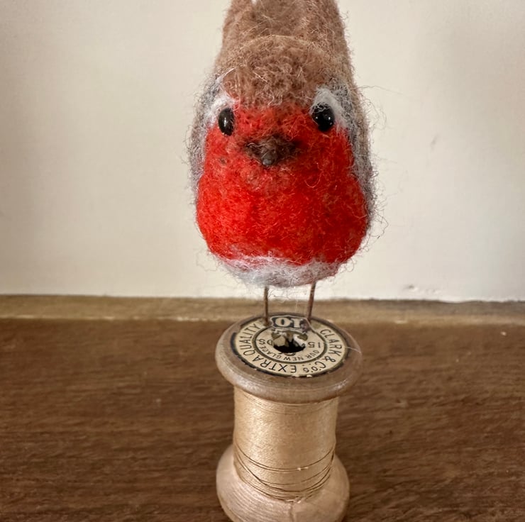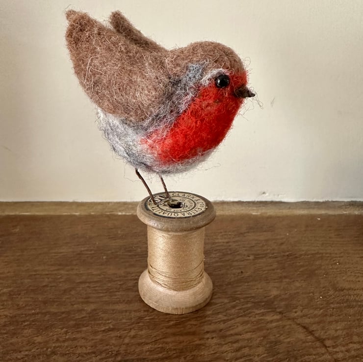 Needle felted wool robin with bead eyes clay beak and wire legs , set in an old wooden bobbin