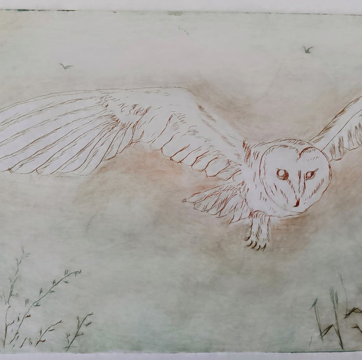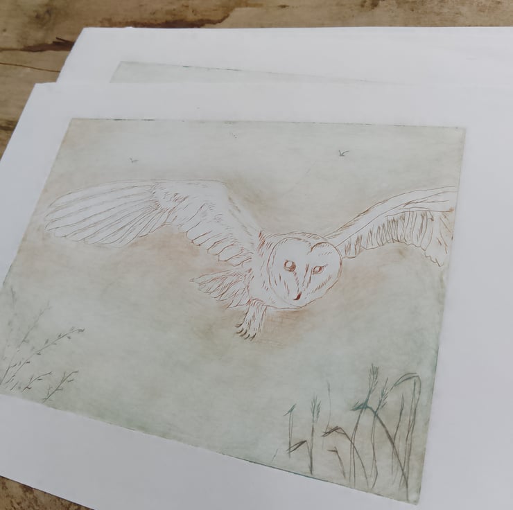 A small, A6 drypoint print on A5 heavyweight watercolour paper , in colour. Each is individually inked and printed by hand,so will be slightly different.