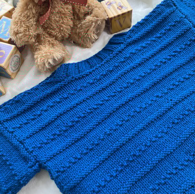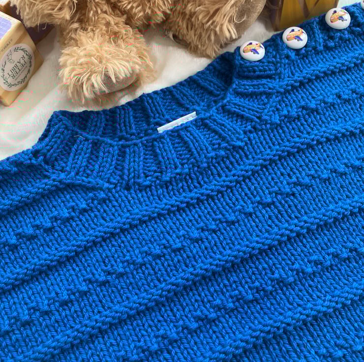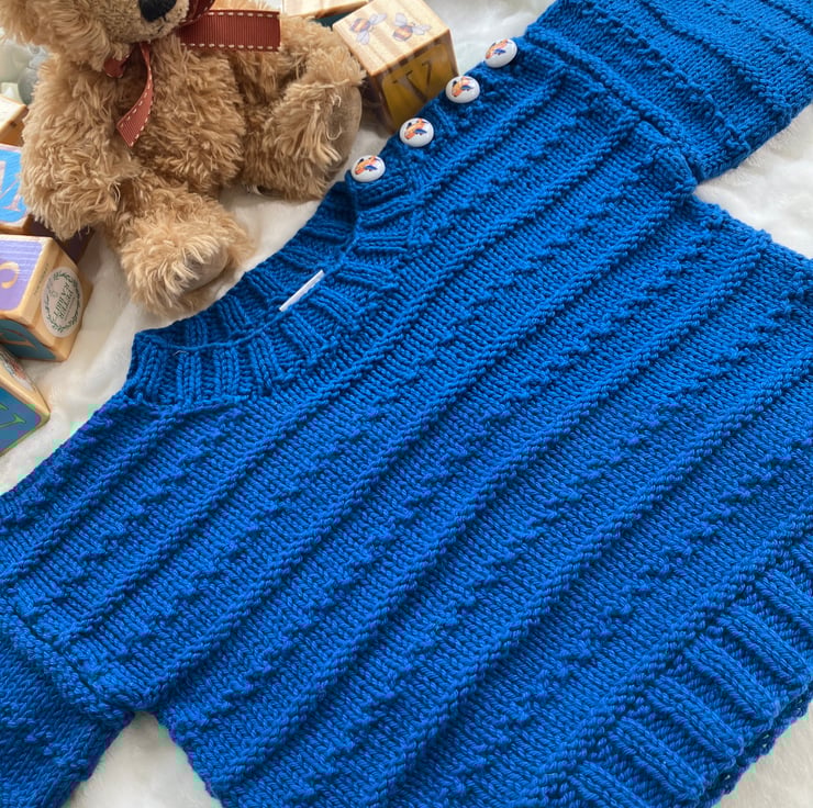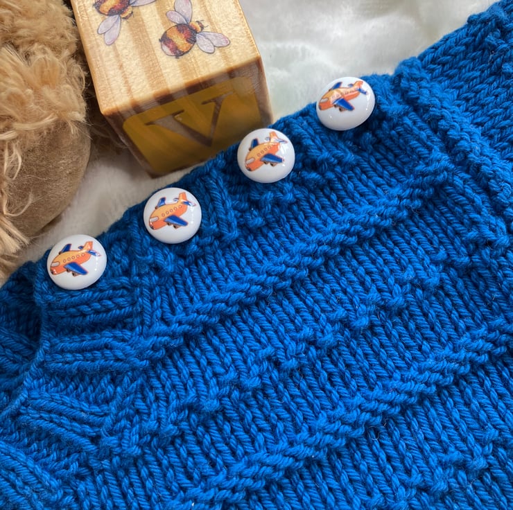 I have knitted this cute little jumper using a cerulean blue cotton yarn - making it cool and breathable for your little one on those hot summer days. Novelty aeroplane buttons on the shoulder make it easier for dressing a wriggling baby and make a contrasting feature. The varied stitches used also give added texture to this lovely little jumper.