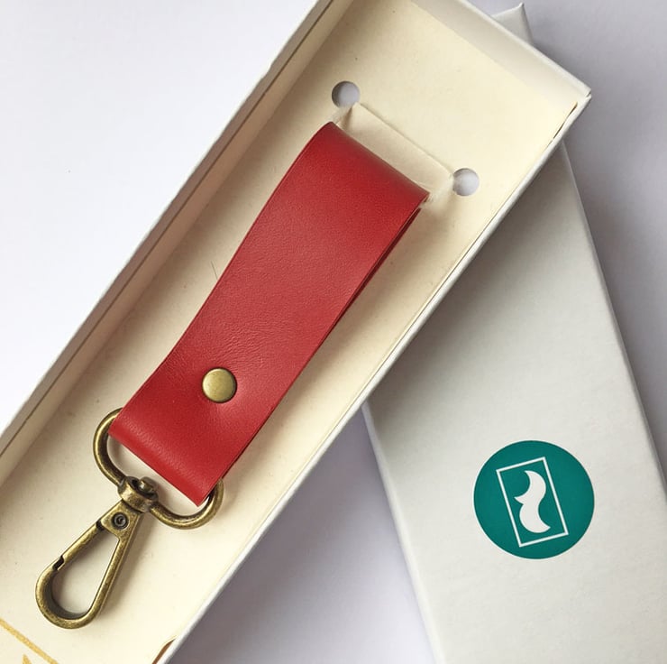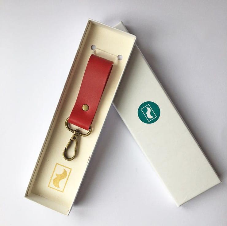Red leather with antiqued brass clasp and rivet. Gift boxed.