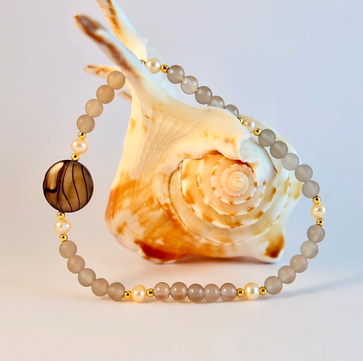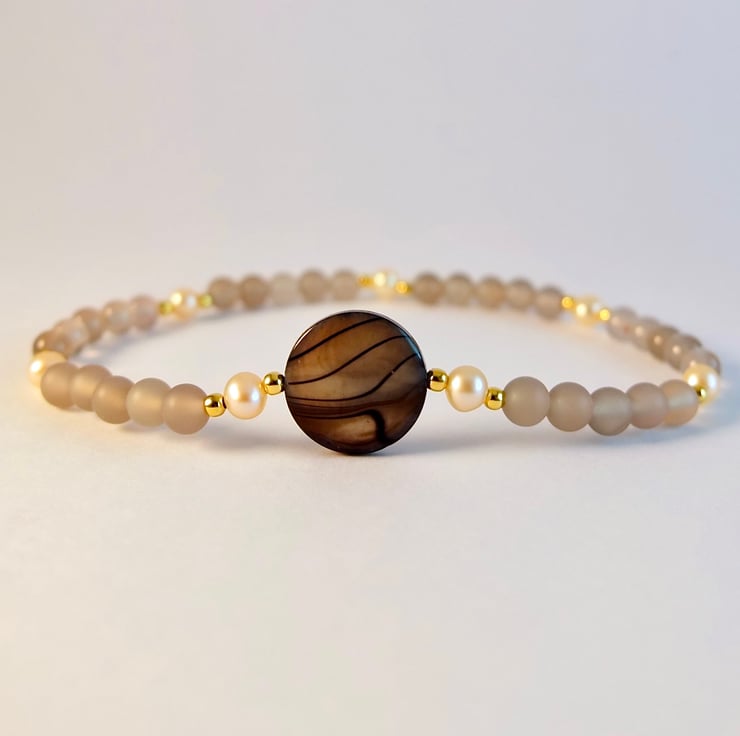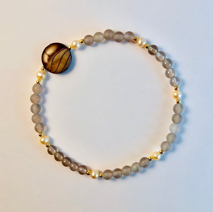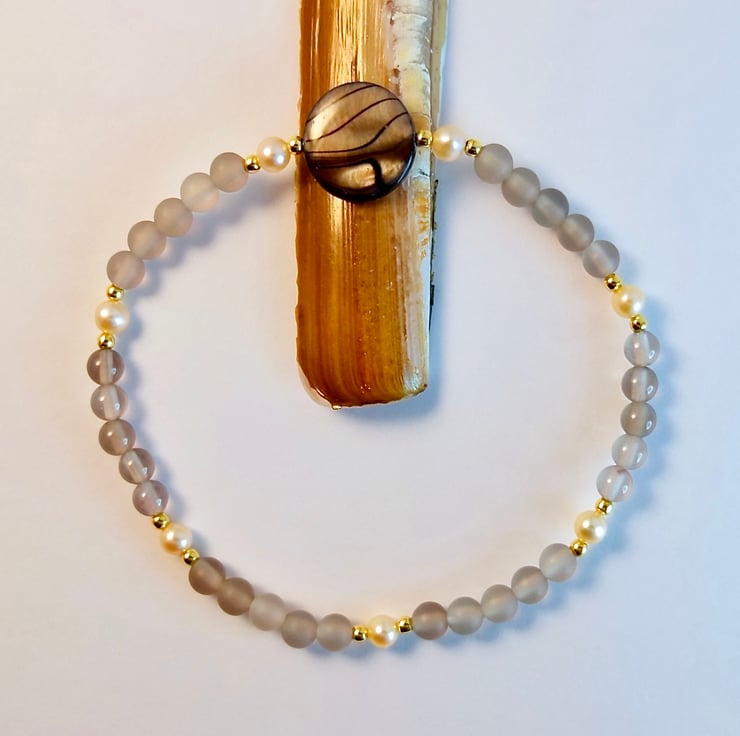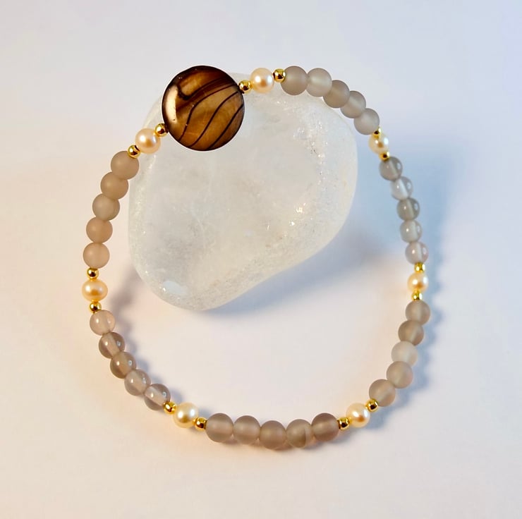 The body of the bracelet is made using a mix of smooth and frosted 4mm grey Agate in rows of five beads each separated by a Pearl highlighted with gold vermeil.