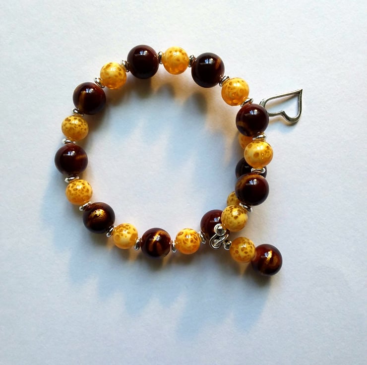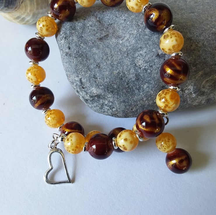 Memory wire bracelet with beautiful chocolate brown glass beads with swirls of gold, accompanied by yellow glass honey comb beads with silver colour donut spacers, and a cute heart charm.