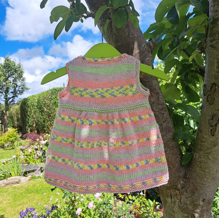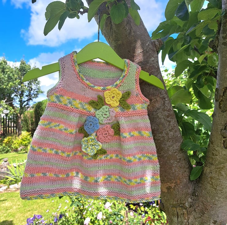0-6 months -cotton/acrylic mix - chest size 20 inch/51cm - length 13 inch/33cm - crochet flower detailing.
