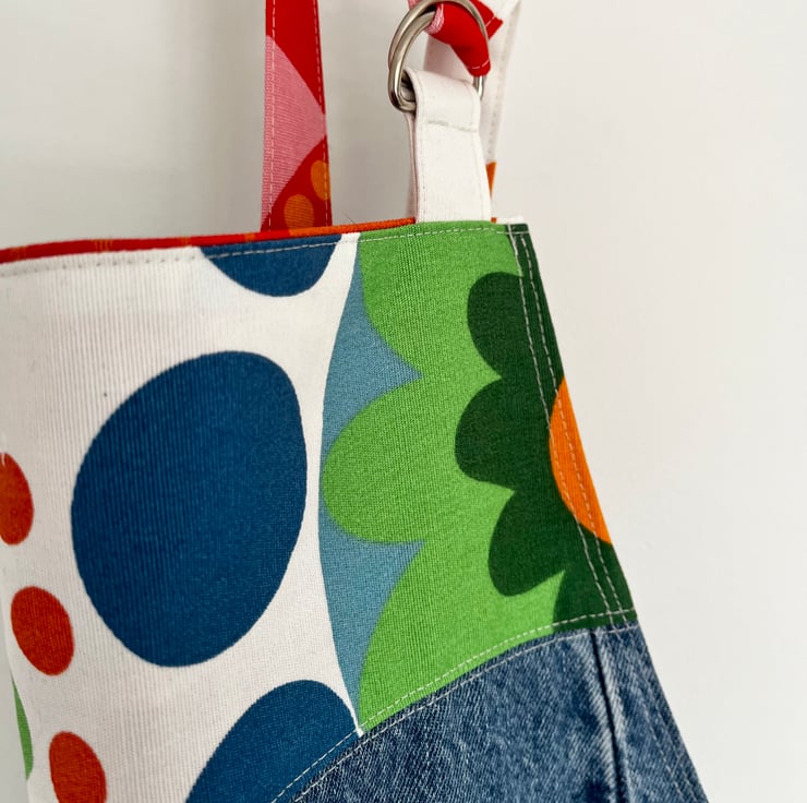 Unique apron made from a pair of jeans and colourful ikea fredrika cotton. The denim is softly worn and forms the main part of the apron. Fredrika cotton with its bold retro pattern is used for the straps, bib and pocket.