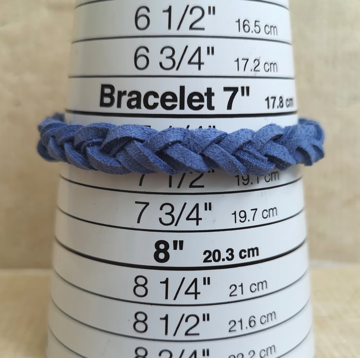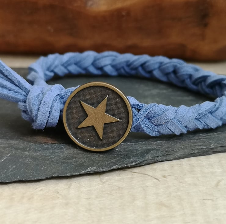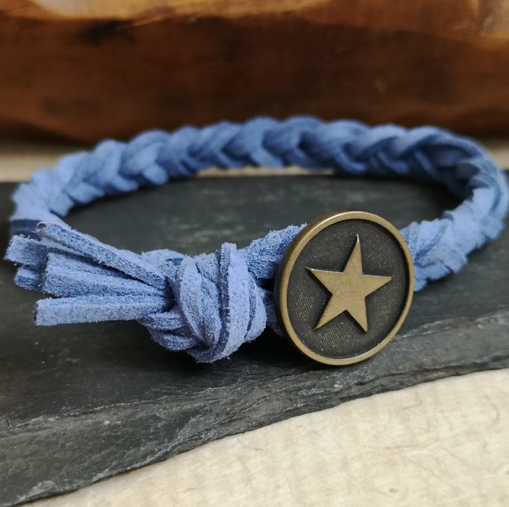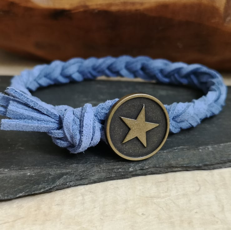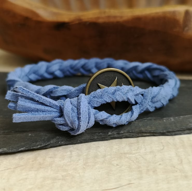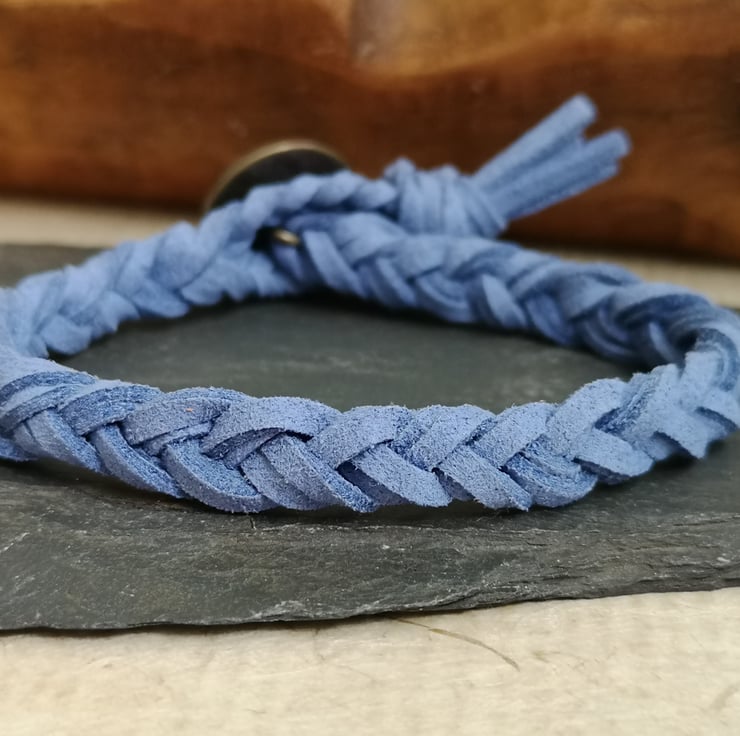 This simple bracelet has been made with a double layer of blue suede cord to make it a little more chunky. The cord has been plaited and a small loop has been made at the end to pass the metal button through to fasten it.