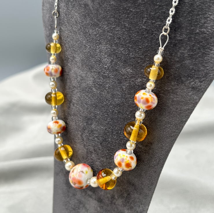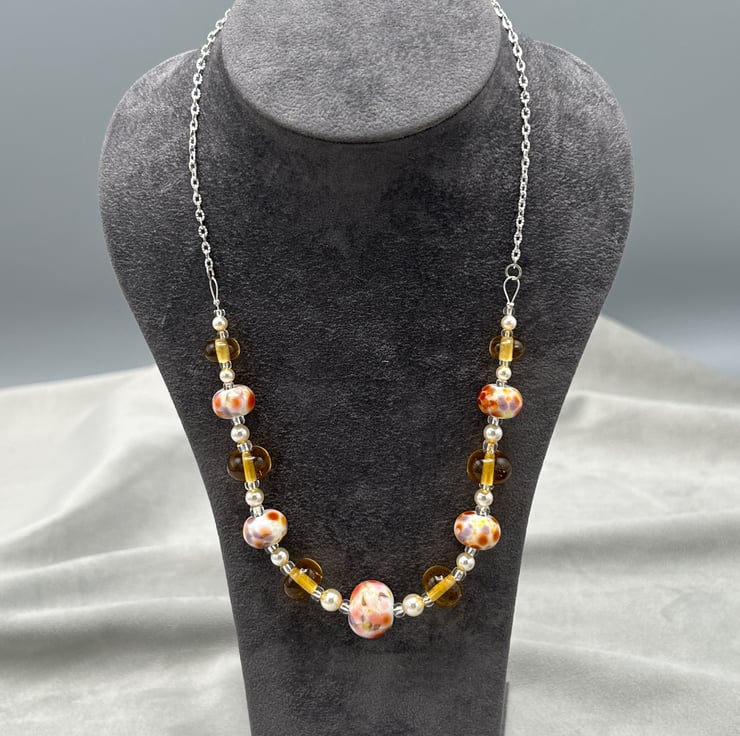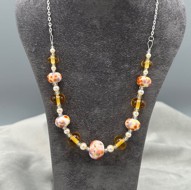 This is an autumn inspired necklace, designed using 11 of my own lampwork glass beads, 6 are a transparent light amber- brown coloured glass (9-12mm diameter approx) and the other 5 lampwork beads have a white base into which different coloured glass fragments have been melted in to give bluepurple, brown, grey, pink and orange shades (11.5-15.5mm diameter).