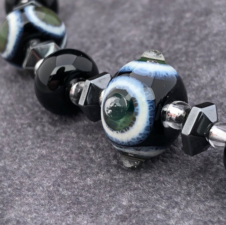 There are six plain black beads that are around 11-13mm in diameter. The lampwork glass is combined with silver lined seed beads and angular disc shaped haematite beads.
